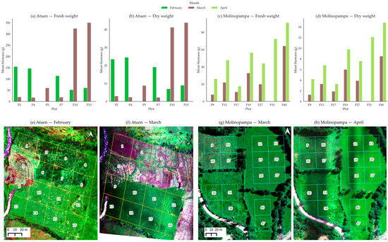 Plot-level variability of aboveground biomass (AGB) in Atuen and Molinopampa. Panels (a–d) present mean fresh and dry biomass per plot across months, while UAV orthomosaics (e–h) illustrate spatial heterogeneity and grazing-induced differences in grassland cover within the plots, where the numbers correspond to individual plot codes used for field biomass sampling in Atuen (e,f) and Molinopampa (g,h).