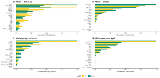 Normalized variable importance derived from RF models for fresh and dry AGB: (a) Atuen–February, (b) Atuen–March, (c) Molinopampa–March, and (d) Molinopampa–April.