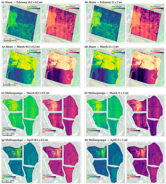 Predicted maps of fresh and dry AGB at two spatial resolutions (0.2 m and 1 m) across sites and months: (a,b) Atuen–February, (c,d) Atuen–March, (e,f) Molinopampa–March, and (g,h) Molinopampa–April. Values are expressed in g m−2.