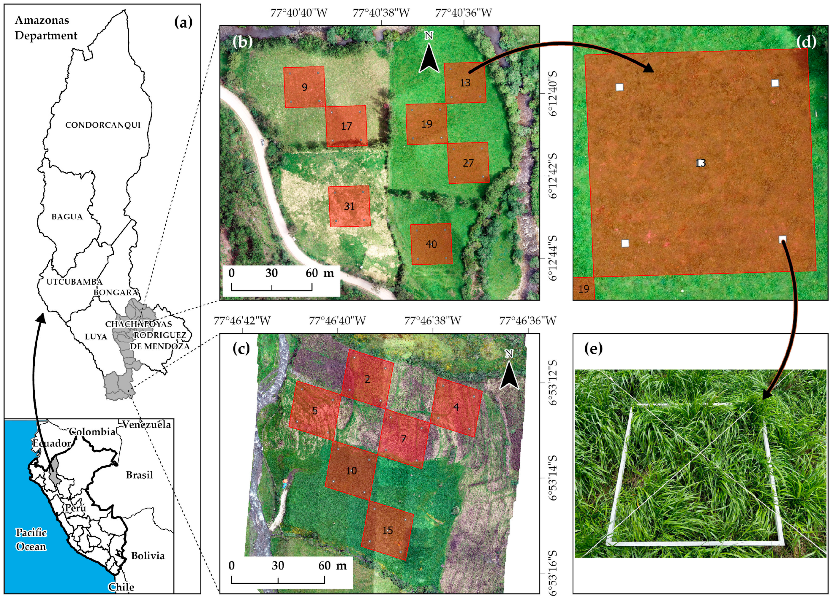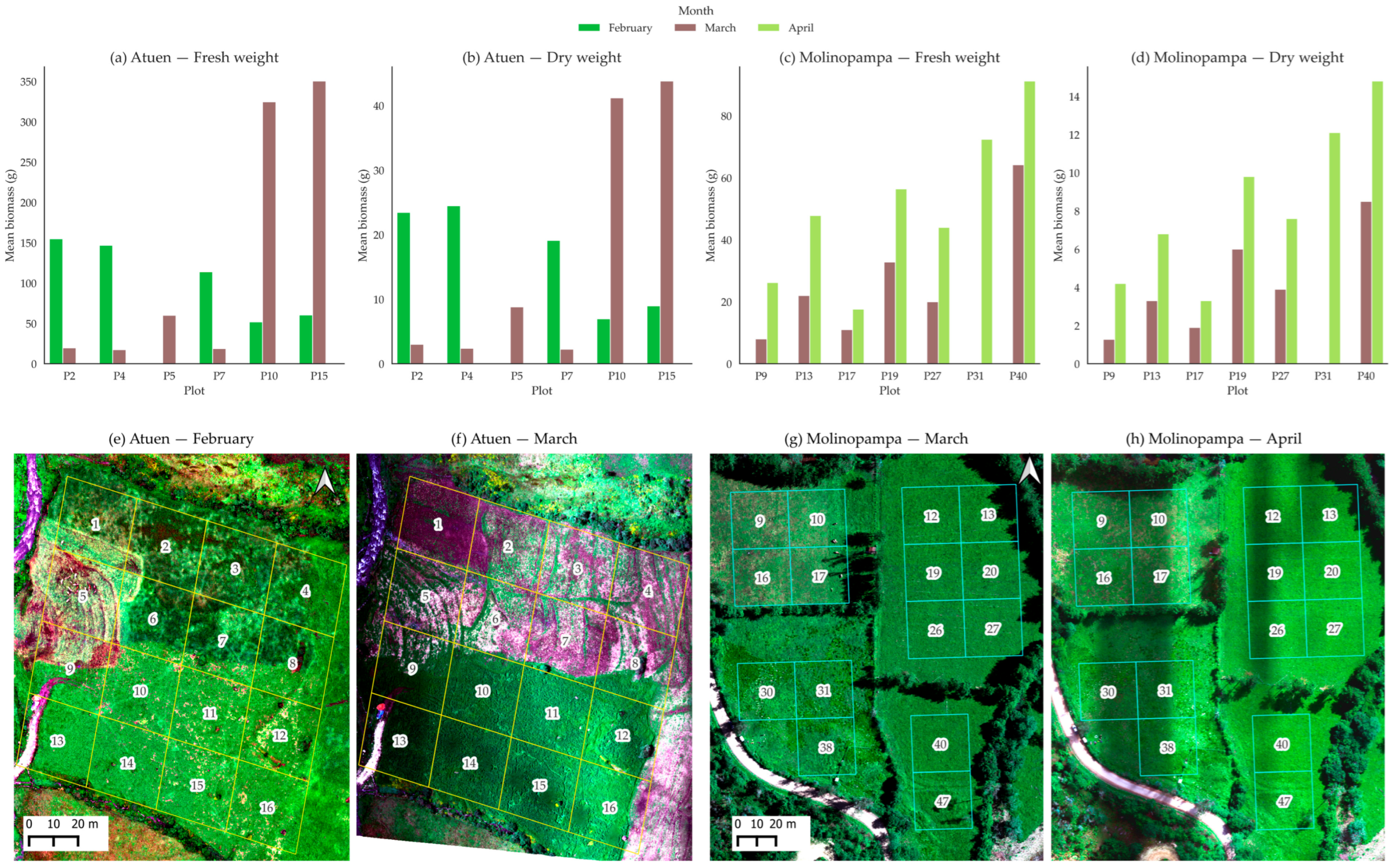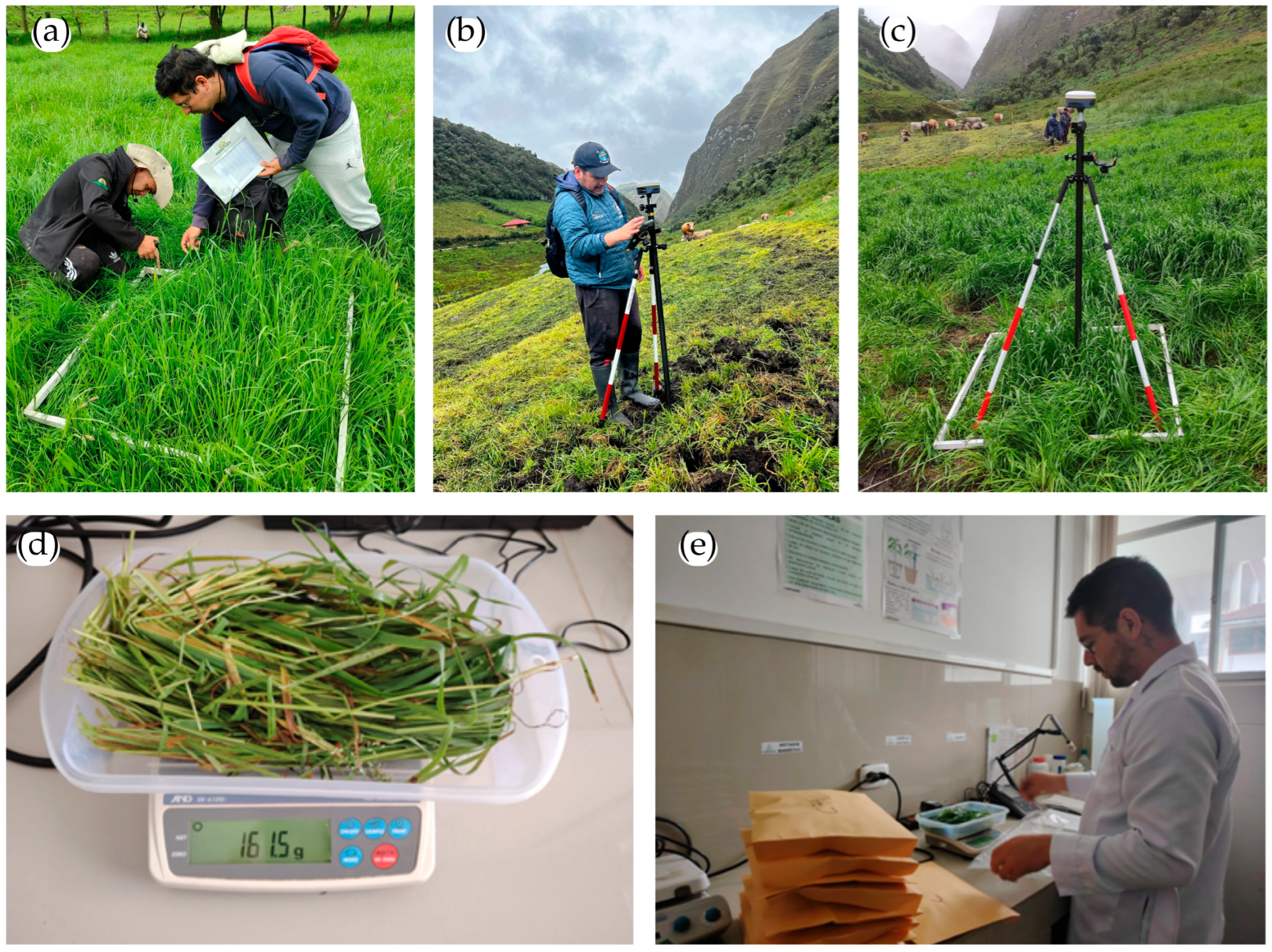 - Sinde-González, I.; Gil-Docampo, M.; Arza-García, M.; Grefa-Sánchez, J.; Yánez-Simba, D.; Pérez-Guerrero, P.; Abril-Porras, V. Biomass Estimation of Pasture Plots with Multitemporal UAV-Based Photogrammetric Surveys. Int. J. Appl. Earth Obs. Geoinf. 2021, 101, 102355. [Google Scholar] [CrossRef]