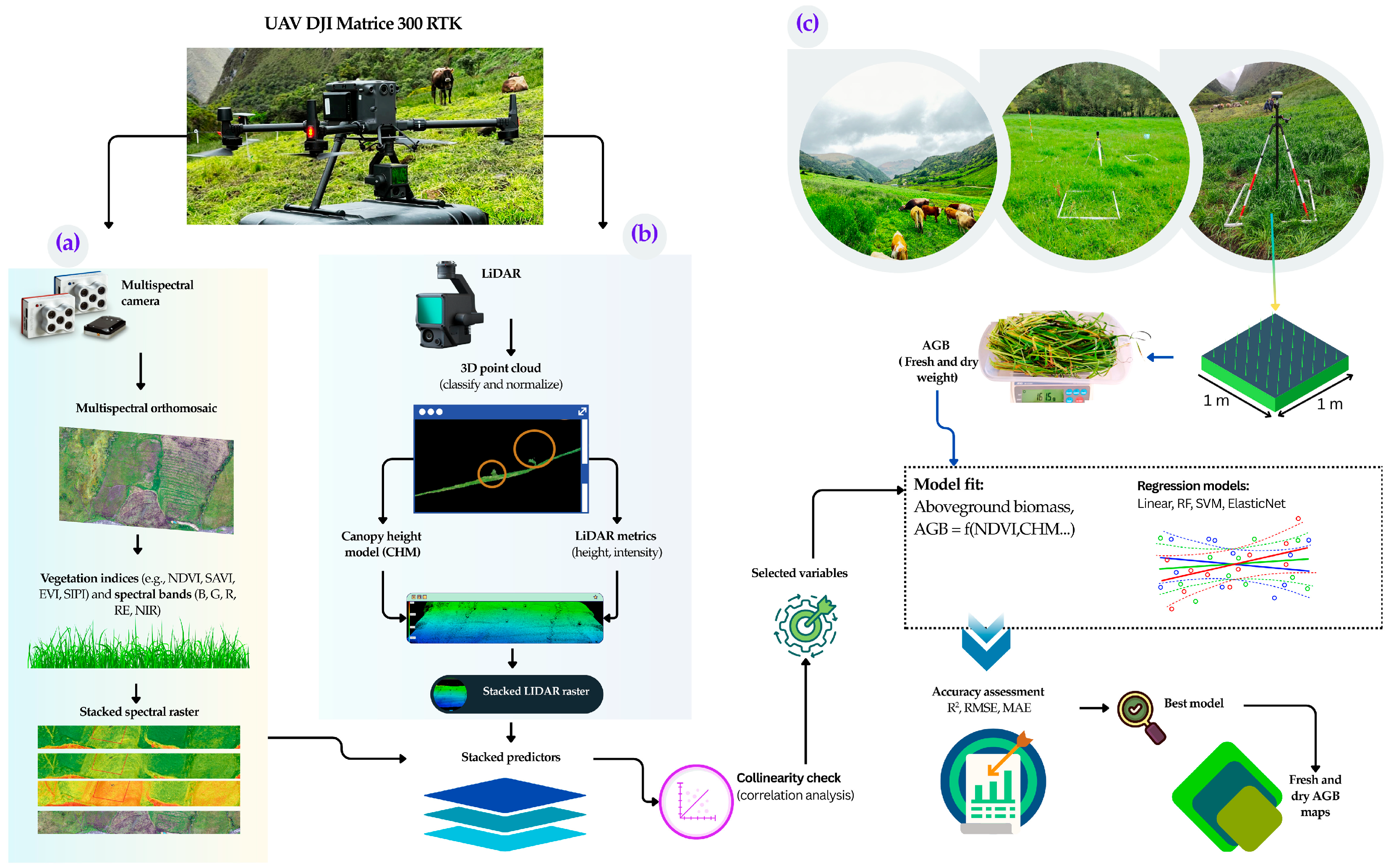 APA StyleMedina-Medina, A. J., Pizarro, S., Tuesta-Trauco, K. M., Zabaleta-Santisteban, J. A., Rivera-Fernandez, A. S., Silva-López, J. O., Salas López, R., Terrones Murga, R. E., Sánchez-Vega, J. A., Silva-Melendez, T. B., Oliva-Cruz, M., Barboza, E., & Cotrina-Sanchez, A. (2025). Integrating UAV LiDAR and Multispectral Data for Aboveground Biomass Estimation in High-Andean Pastures of Northeastern Peru. Sustainability, 17(21), 9745. https://doi.org/10.3390/su17219745