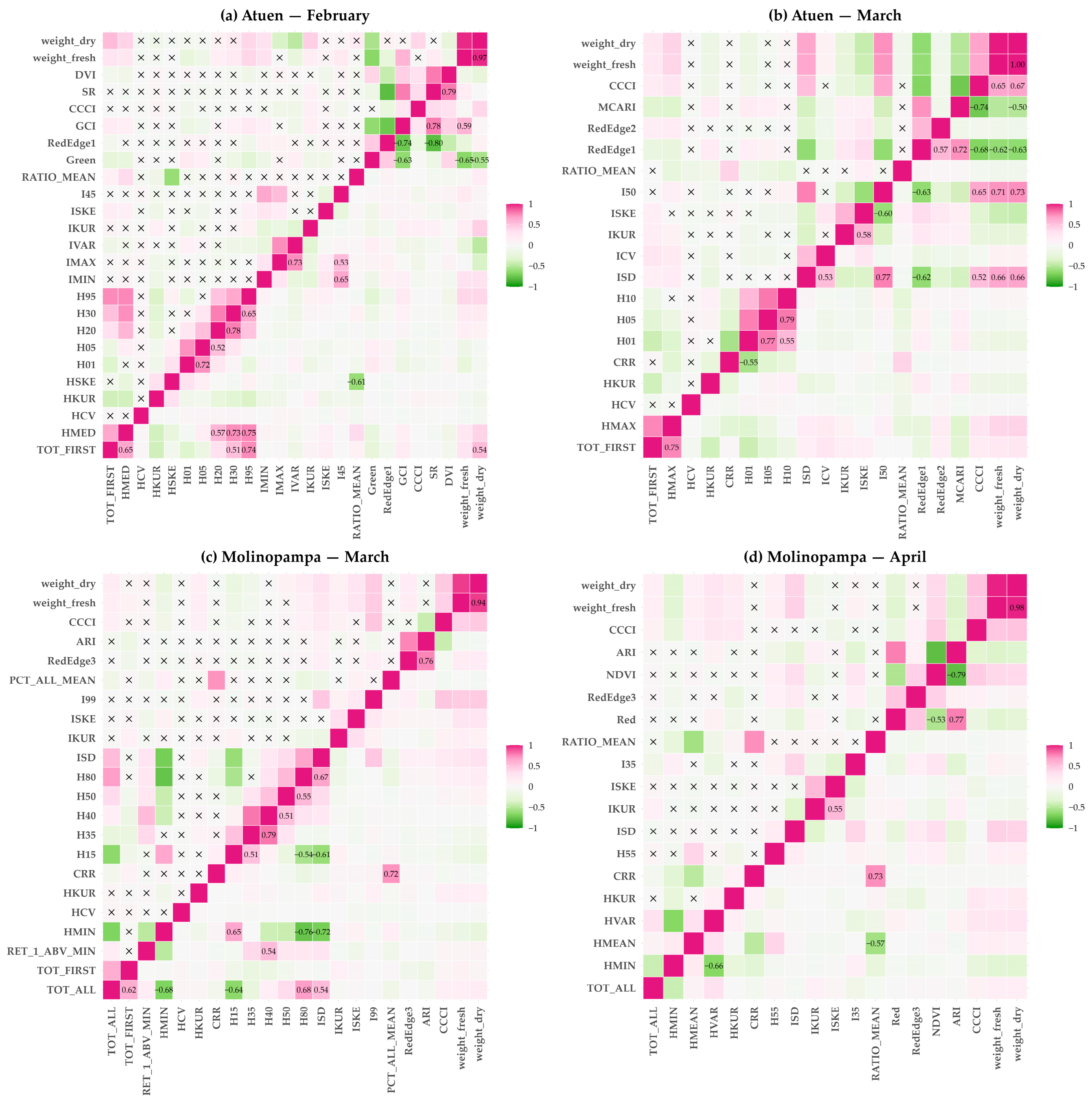 - Urquizo, J.; Ccopi, D.; Ortega, K.; Castañeda, I.; Patricio, S.; Passuni, J.; Figueroa, D.; Enriquez, L.; Ore, Z.; Pizarro, S. Estimation of Forage Biomass in Oat (Avena Sativa) Using Agronomic Variables through UAV Multispectral Imaging. Remote Sens. 2024, 16, 3720. [Google Scholar] [CrossRef]
