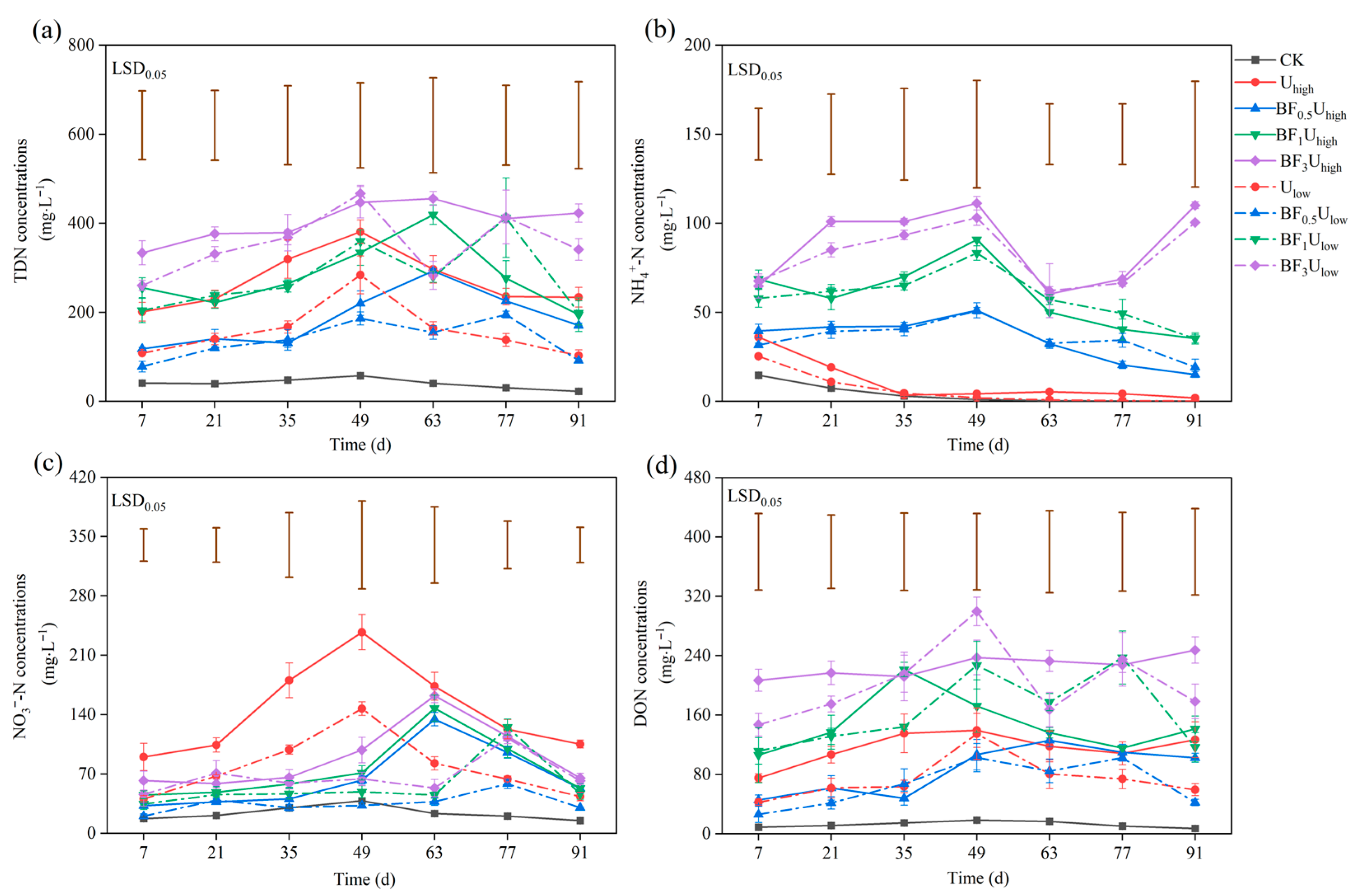 | Treatment | TDN (mg·kg−1) | NH4+-N (mg·kg−1) | NO3−-N (mg·kg−1) | DON (mg·kg−1) | NH4+-N/NO3−-N |