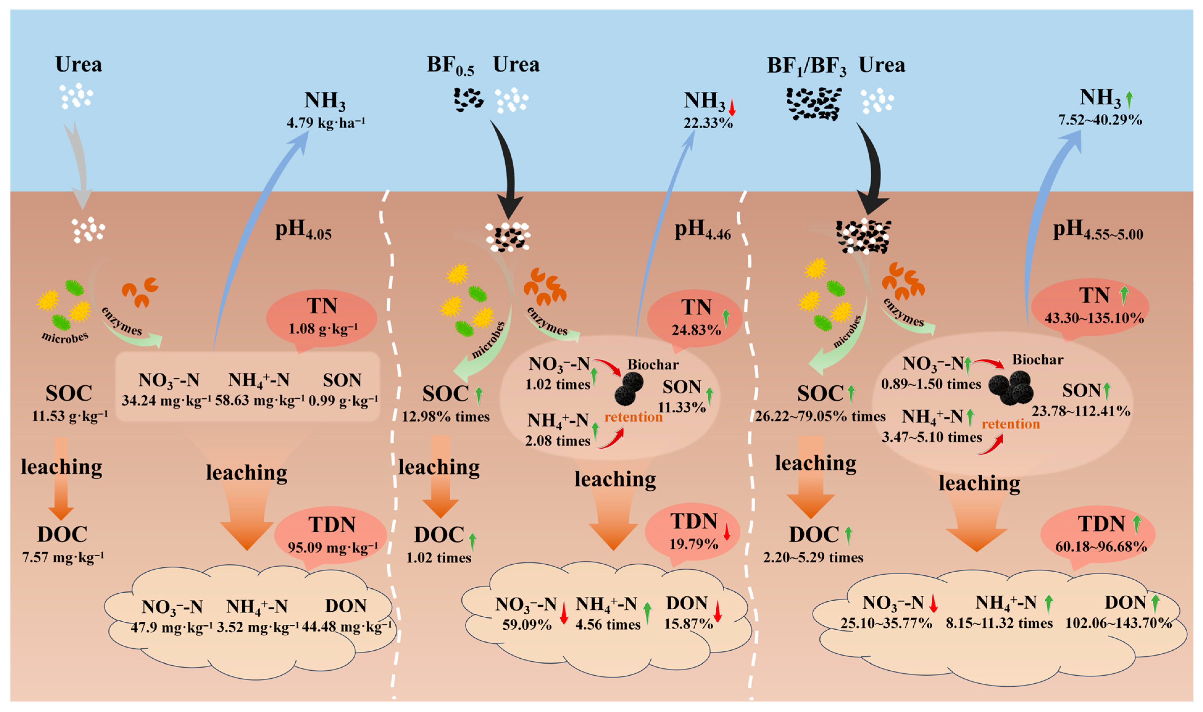 4.3. Effects of Biochar-Based Fertilizer on Soil Nitrogen and Physicochemical Properties in Tea Orchard Soils