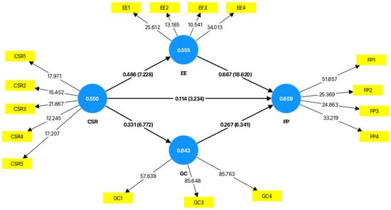 66], who underline that green innovation represents the power to reduce costs, gain a competitive edge, and ensure the resilience of an organization. Third, the findings indicate that both EE and GC mediate the CSR-FP relationship, but EE has a stronger influence. This emphasizes the two-way channel through which CSR can be converted into financial performance by enhancing the commitment of employees and the other by encouraging environmentally innovative practices.