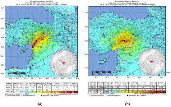 Straddling the continents of Asia and Europe, Turkey is predominantly located on the Anatolian Peninsula. Its diverse landscapes have been formed by a wide range of tectonic processes throughout geological history. This tectonic activity continues today, driven by the convergence of the African Plate with the Eurasian Plate, which propels the Anatolian Plate westward and southwestward along strike-slip faults []. The principal fault systems in Turkey are the North Anatolian Fault Zone (NAFZ) and the East Anatolian Fault Zone (EAFZ). The former shapes the current plate boundary of Eurasia near the Black Sea coast, while the latter forms part of the boundary of the North Arabian Plate in the southeast []. Turkey’s seismically active geology—characterized by recent faulting and folding, with ongoing orogenic processes—makes the country susceptible to frequent earthquakes of varying magnitudes []. More recently, two consecutive and powerful earthquakes occurred in Kahramanmaras Province, located in southern Turkey. On 6 February 2023, at 04:17 local time, the first intense earthquake (in the Pazarcik district, Kahramanmaras) with a magnitude of Mw 7.8 hit southern and central Turkey and northern and western Syria. It was followed by a second earthquake with a magnitude of Mw 7.7 (in Elbistan district, Kahramanmaras) at 13:24 local time the same day. The Pazarcik earthquake had an epicenter at 37.166° N; 37.032° E, approximately 34 km west of Gaziantep Province, near the Syrian border. The following Elbistan earthquake had an epicenter at 38.089° N; 37.239° E, situated about 95 km northeast of the former earthquake. The Pazarcik and Elbistan earthquakes had shallow focal depths of 8.6 and 7.0 km, respectively, and both shocks were caused by strike-slip faulting within the EAFZ. In the earthquake-stricken areas, a total of 45,756 aftershocks were recorded within the first year following the earthquakes []. The corresponding shakemaps of these earthquakes are given in Figure 1 [,].