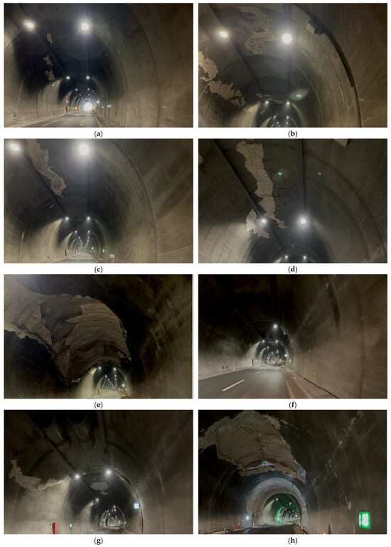 Following the Kahramanmaras earthquakes, a comprehensive investigation was conducted to assess the extent of the damage in the Erkenek Tunnel. This process involved the collection of geotechnical investigation reports, geological condition assessments, approved design documents, and construction records. Subsequently, a field survey—similar in approach to that of the Structural Extreme Events Reconnaissance (StEER) Network—was carried out to identify and classify the various types of structural damage []. Previous studies have reported that the most common forms of earthquake-induced damage in tunnels include cracking of the lining, concrete spalling and collapse, shear failure of the lining, portal cracking, damage at construction joints, slope-induced collapses near portals, groundwater leakage, sidewall and invert deformation, tunnel floor heaving, and pavement damage [,]. Among these, lining cracks are the most frequently observed seismic damage type, typically categorized into four distinct patterns: longitudinal cracks, transverse cracks, inclined cracks, and enclosed (ring) cracks []. Based on this generally accepted classification, the earthquake-driven damages detected in the Erkenek Tunnel are categorized and summarized in Table 1, and their field pictures are given in Figure 2.