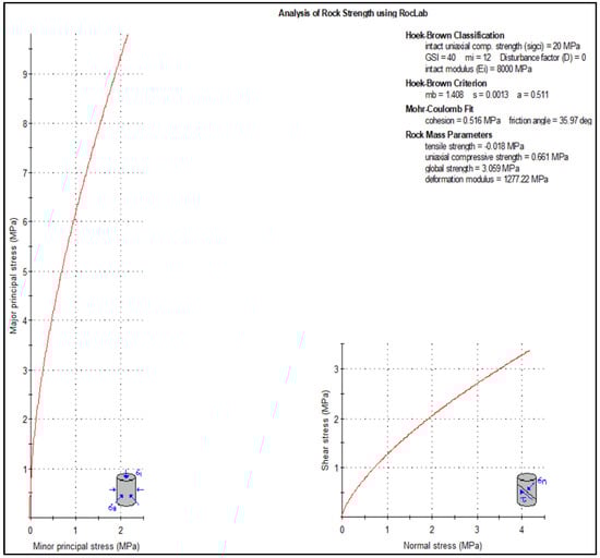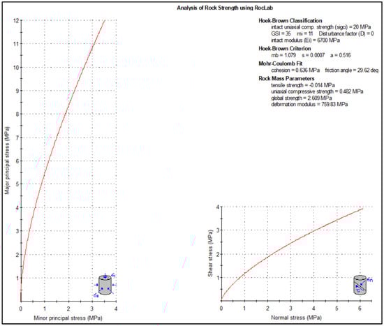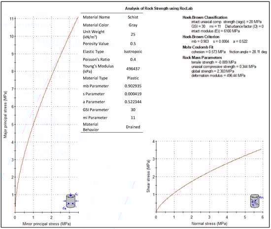 The deformation parameters forming the basis of the restoration works are based on a set of assumptions and calculations. In the analytical models, the rock units were accepted as elasto-plastic materials according to the Hoek-Brown failure criterion, and the relevant strength and deformation parameters were determined from geological and geotechnical studies. According to the NATM classification, the tunnel sections currently fall under support classes B2–B3, C2, and C3, depending on the local ground conditions. The initial stresses around the excavation boundary are functions of the overburden depth and the elastic properties of the materials. The vertical stress along the tunnel boundary is generally proportional to the overburden depth []. In this respect, the geometry of the existing tunnel section was used to estimate the overburden pressure in this study. The coefficient of lateral earth pressure at rest, “K0”—defined as the ratio of the average horizontal stress to the vertical stress—was calculated using Equation (1) []. The calculated K0 values are given in Table 2.