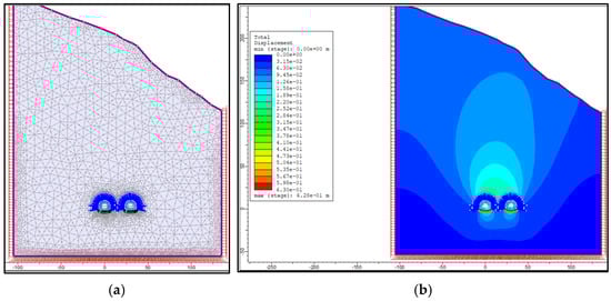Back-analysis model of the current situation at K76 + 950 by FEM; (a) Model setup, (b) Total displacement.