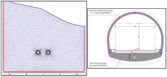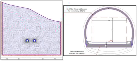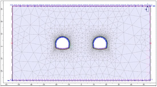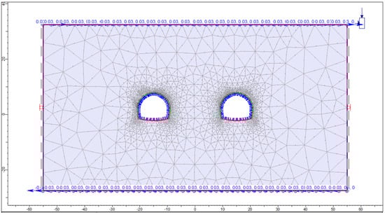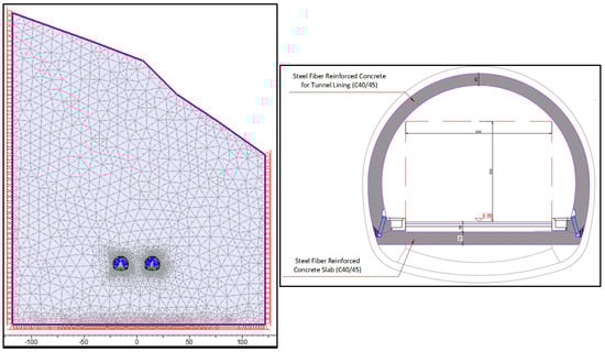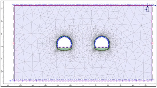 The same tunnel section (C2 rock class at K76 + 200) was also analyzed, considering the invert. The tunnel and surrounding ground were modeled by the FEM (Figure 15), and the resulting tunnel displacements are shown in Figure 16a. The internal forces on the primary lining are presented in Figure 16b–d.
