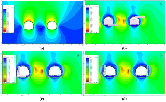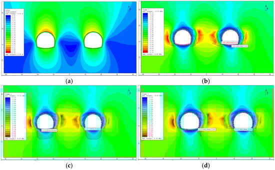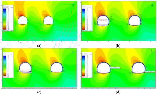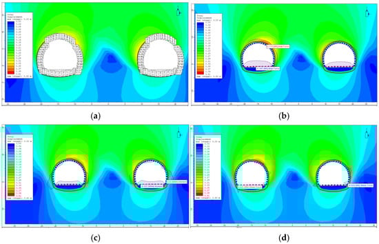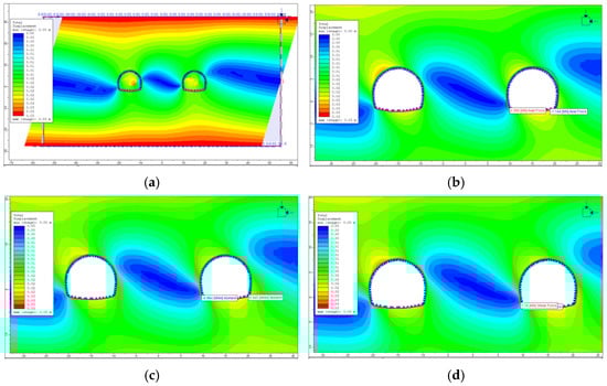 The modeling stages of each tunnel section under static loading conditions are given in Figure 4. The initial stress state is given in Figure 4a, whereas the closest approximation of the primary support system pressure to actual field conditions is illustrated in Figure 4b. The final modeling scenario (Figure 4c) represents the case in which the primary lining is reconstructed under the assumption that the existing primary support elements have completely lost their functionality over the long term.
