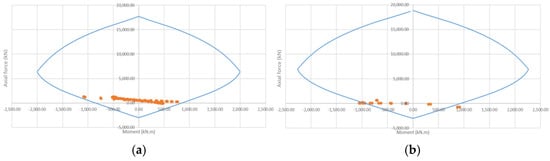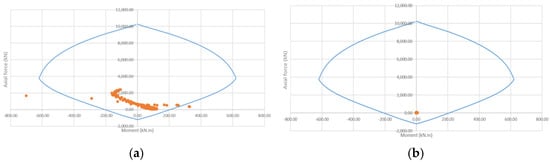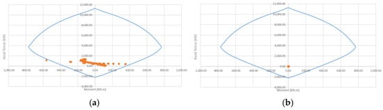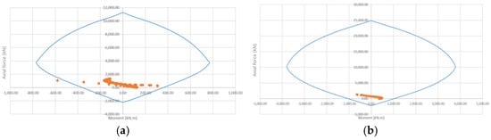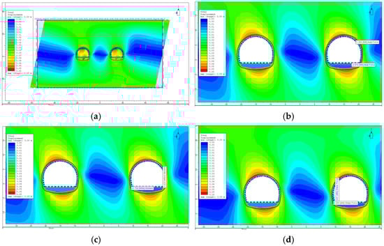 The tunnel and surrounding ground were modeled with the FEM, and the displacements of the inner lining under static loading conditions were analyzed; the results are given in Figure 9a. The internal forces (axial force, bending moment, and shear force) acting on the tunnel primary lining and invert slab are presented in Figure 9b–d.