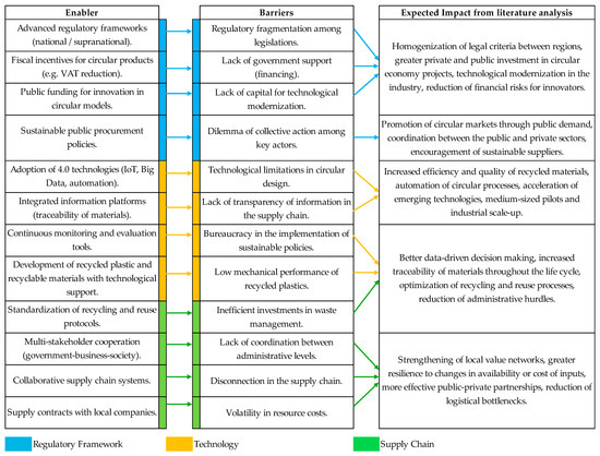 Therefore, the literature consistently identifies the plastic packaging sector as both a hotspot of environmental impact and a frontier for circular innovation. Yet, research has traditionally segmented its analysis into barriers or enablers, failing to capture their interdependent dynamics. This omission constrains theoretical development and leads to fragmented practical strategies. The present study contributes by advancing an integrative framework that situates enablers and barriers within a systemic model of interaction by analyzing how regulatory, technological, and supply chain enablers interact with corresponding barriers, producing both synergies and tensions.