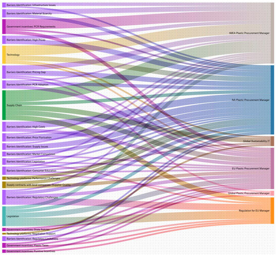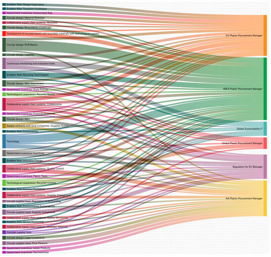 To visualize the relational patterns emerging from the coding process, Sankey network diagrams were generated using ATLAS.ti 23. These diagrams illustrate the relational density among managerial roles, enablers, barriers, and CE practices identified in the interviews. Although visually complex, they provide a transparent representation of how specific concepts overlap across roles and highlight the degree of convergence and divergence in managerial perceptions.