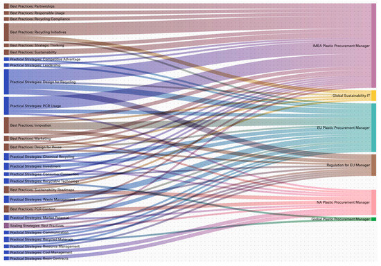 Findings also demonstrated variation in the prioritization of CE practices depending on managerial role and regional context. Figure 5 presents the distribution of CE practices by managerial role identified in the analysis of interviews, showing how responsibilities and regional contexts shape the emphasis on different enablers and strategies. It is shown that the Procurement Manager for India, Middle East, and Africa (IMEA) engages with the widest range of best practices, such as partnerships, responsible usage, and recyclable technology, reflecting the need for adaptive, multifaceted strategies in regions with less developed recycling infrastructure. In addition to the region’s advanced regulatory landscape, the EU Procurement Manager emphasizes the importance of design for recycling, the use of PCR, and chemical recycling.