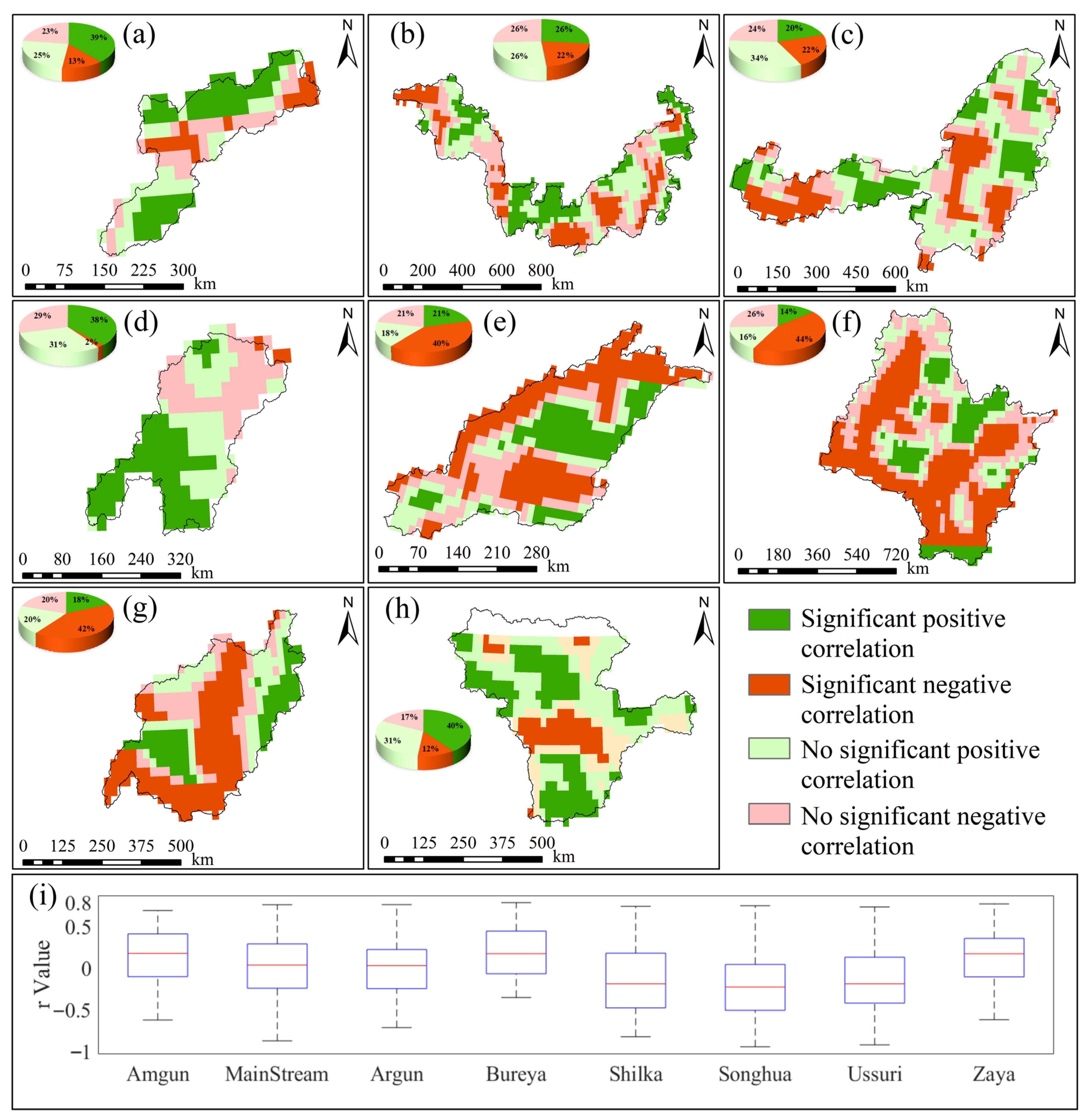 3.4.2. Spatial Heterogeneity Analysis of GWSA and PRE