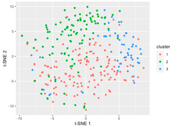Two-dimensional t-SNE (t-Distributed Stochastic Neighbor Embedding) visualization of the three clusters selected for this study.