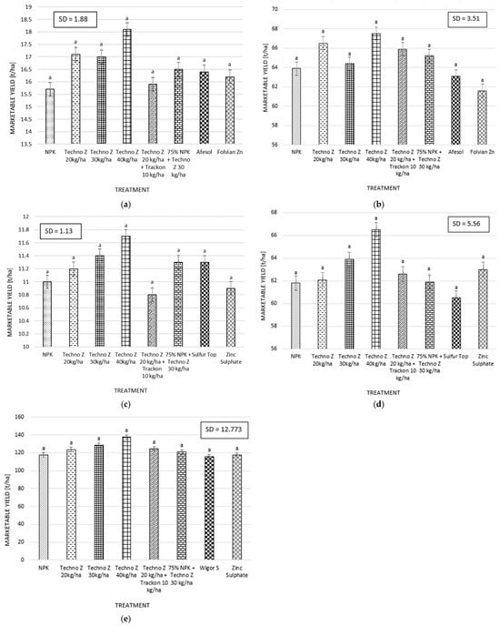 Marketable yield for specific treatments (a) after triple application in Spain (SP-1); (b) after double application in Spain (SP-2); (c) after triple application in Italy (IT-1); (d) after double application in Italy (IT-2); (e) after triple application in Poland. Different lowercase letters indicate a statistically significant difference.