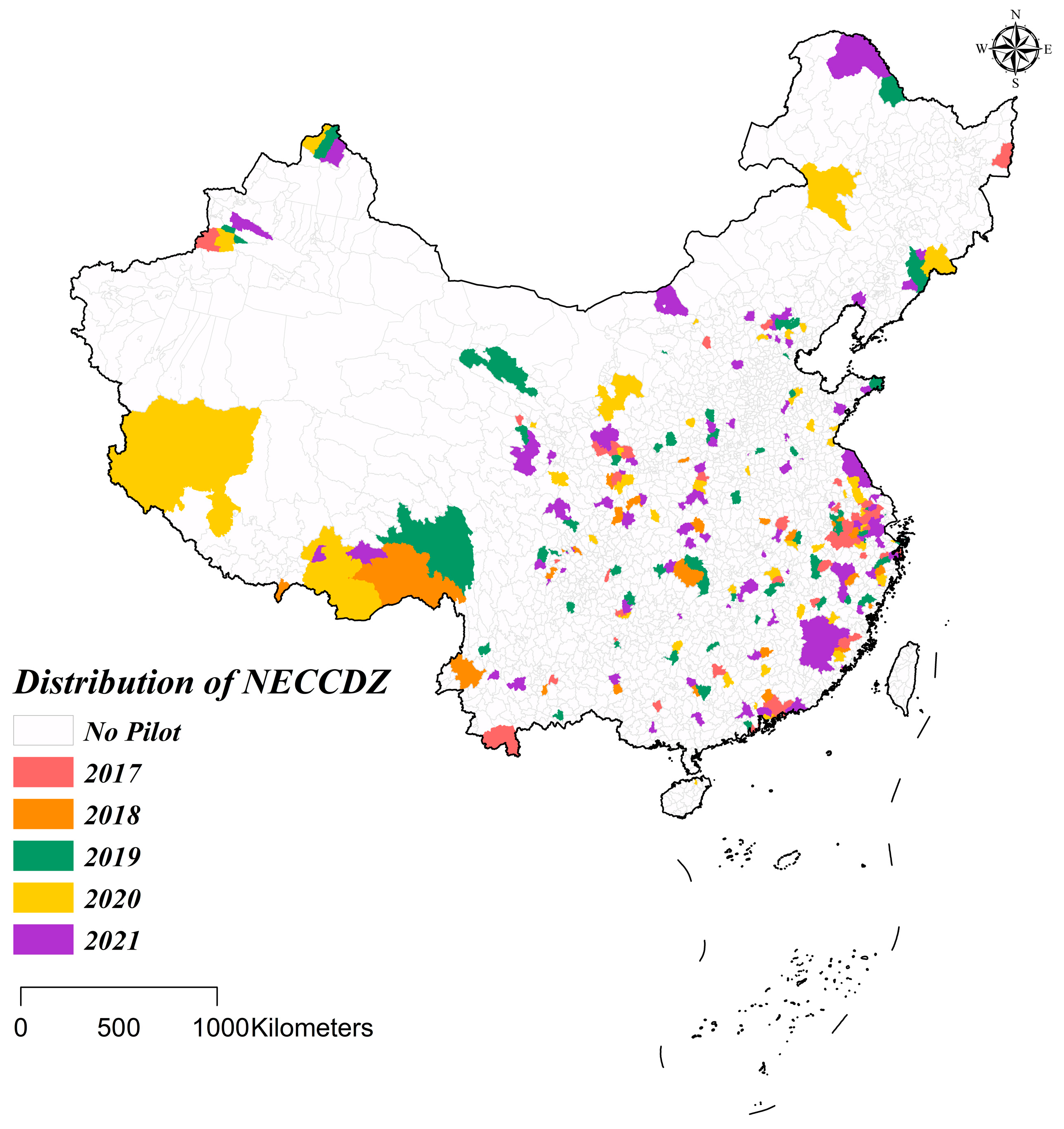 To address these gaps, this study constructs a balanced panel dataset of Chinese counties spanning 2010–2022 and employs a difference-in-differences (DID) approach to estimate the impact of the NECCDZ policy on PM2.5 concentrations. Furthermore, a mediation analysis framework is introduced to examine the roles of land use efficiency and green innovation capacity in the policy transmission mechanism, aiming to uncover the environmental effects and underlying logic of the policy from a finer spatial perspective.