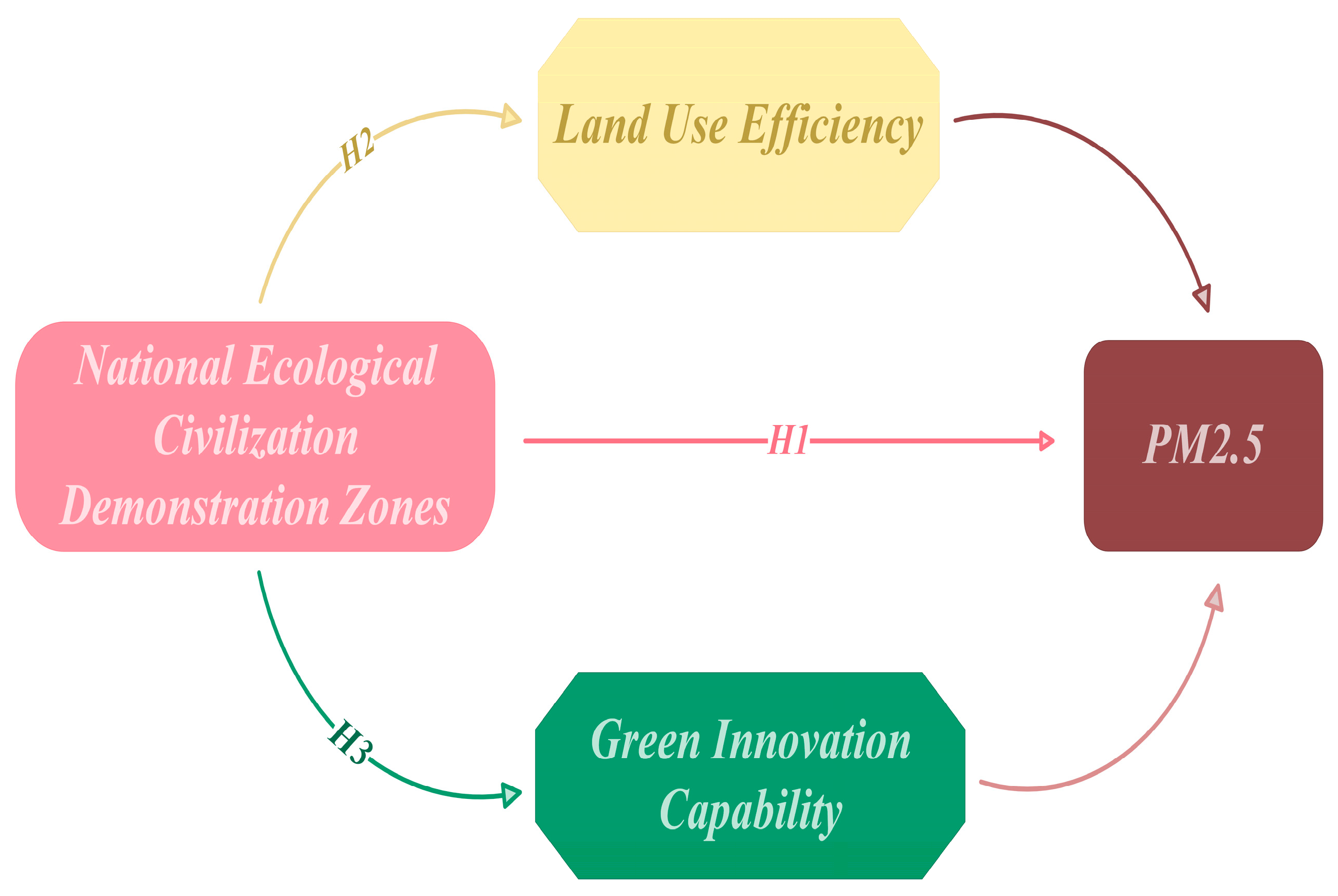 Although new empirical evidence has emerged, the relationship between the NECCDZ policy and PM2.5 concentrations remains inconclusive, and several research gaps persist, listed as follows: (1) most existing studies focus on the relationship between economic growth and carbon emissions, lacking a systematic evaluation of the causal link between the NECCDZ policy and PM2.5 pollution; (2) empirical analyses are primarily conducted at the provincial or municipal level, with limited research at the county level, which restricts a deeper understanding of spatial heterogeneity and urban–rural integration; and (3) the mechanisms through which the NECCDZ policy influences air pollution have not been fully explored, particularly regarding the mediating roles of technological innovation and land use efficiency. This study aims to systematically evaluate the emission reduction effects of the NECCDZ policy on PM2.5 pollution and to reveal its underlying mechanisms and regional heterogeneity, thereby providing empirical evidence and policy insights for ecological governance and green development strategies.