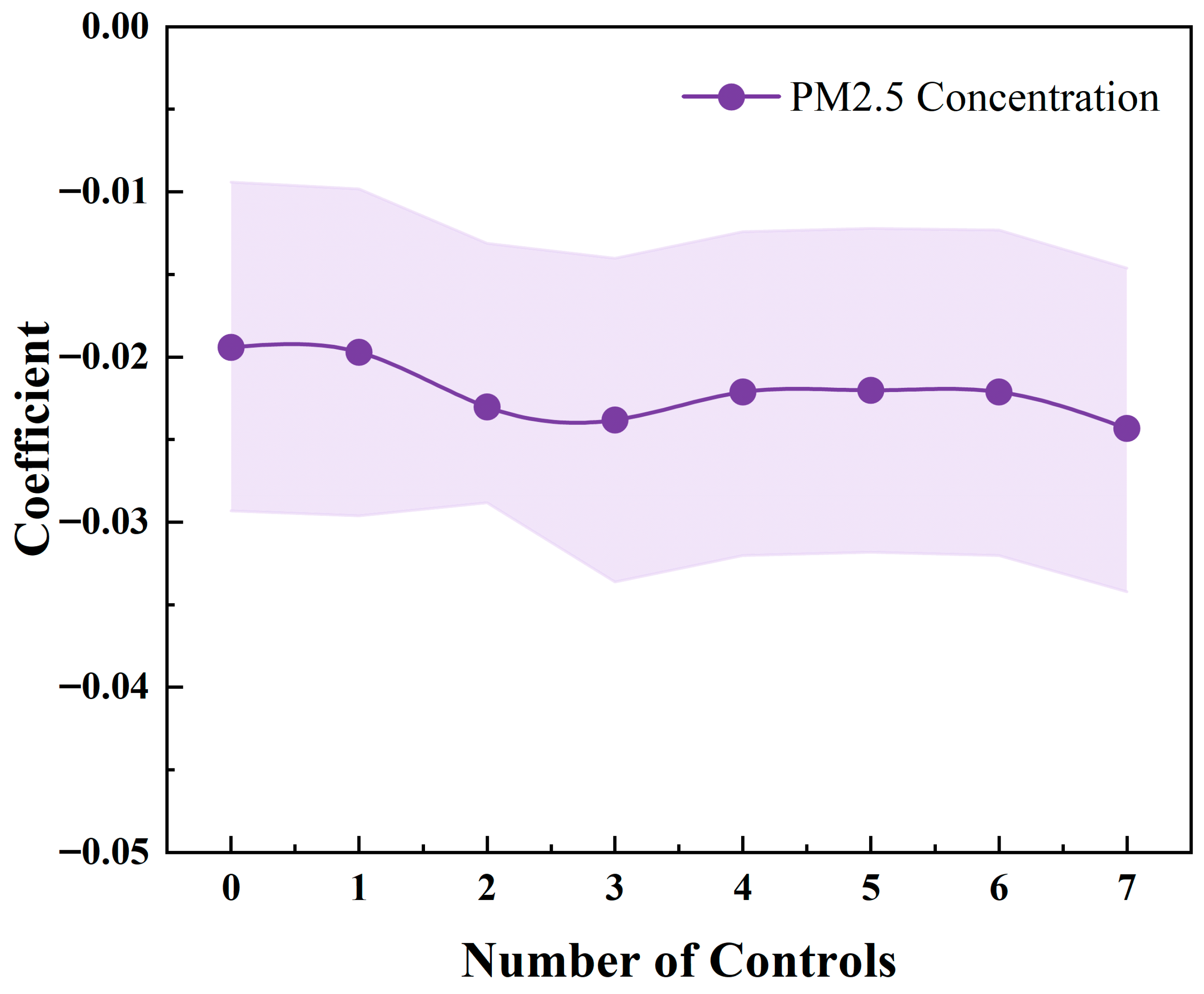 2 values observed in all specifications, hovering around 0.998, imply that the two-way fixed effects model effectively captures most of the unobserved heterogeneity across both spatial and temporal dimensions. This highlights its strong capacity to explain the variation in PM2.5 concentrations. Taken together, the baseline estimation results offer compelling and consistent support for the view that NECCDZ implementation leads to a marked decline in PM2.5 concentrations within the affected regions. This finding remains robust across a range of model frameworks.The changes in regression coefficients and error bars with the incremental addition of control variables are shown in
