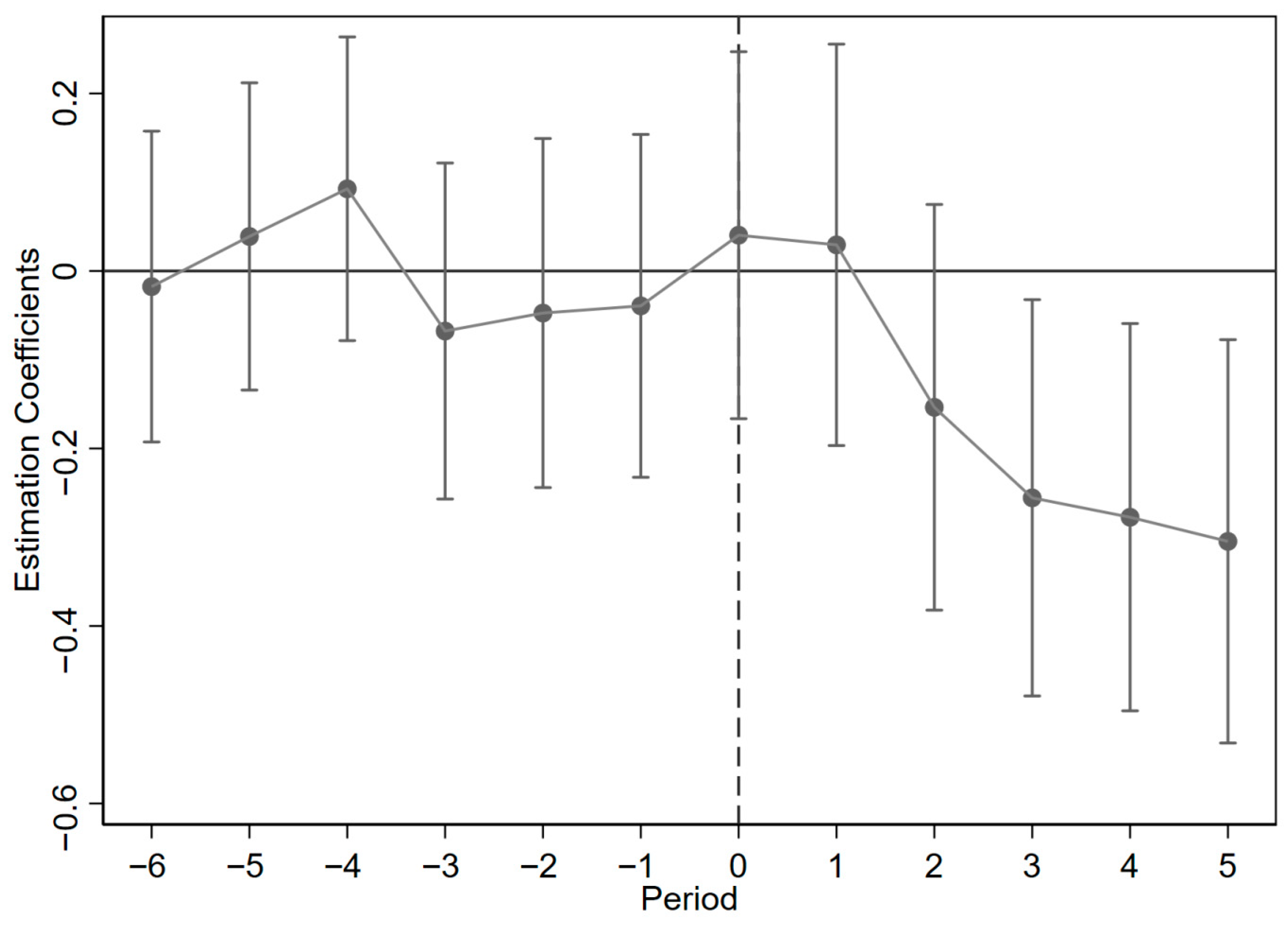 51]. A credible attribution of the estimated impact to the policy intervention is possible only if a statistically meaningful gap emerges between the treatment and control groups after the policy takes effect. Drawing on established research practices, this paper employs an event study approach to examine whether the parallel trends assumption holds. The method for conducting the parallel trends test is used to set up the following model: