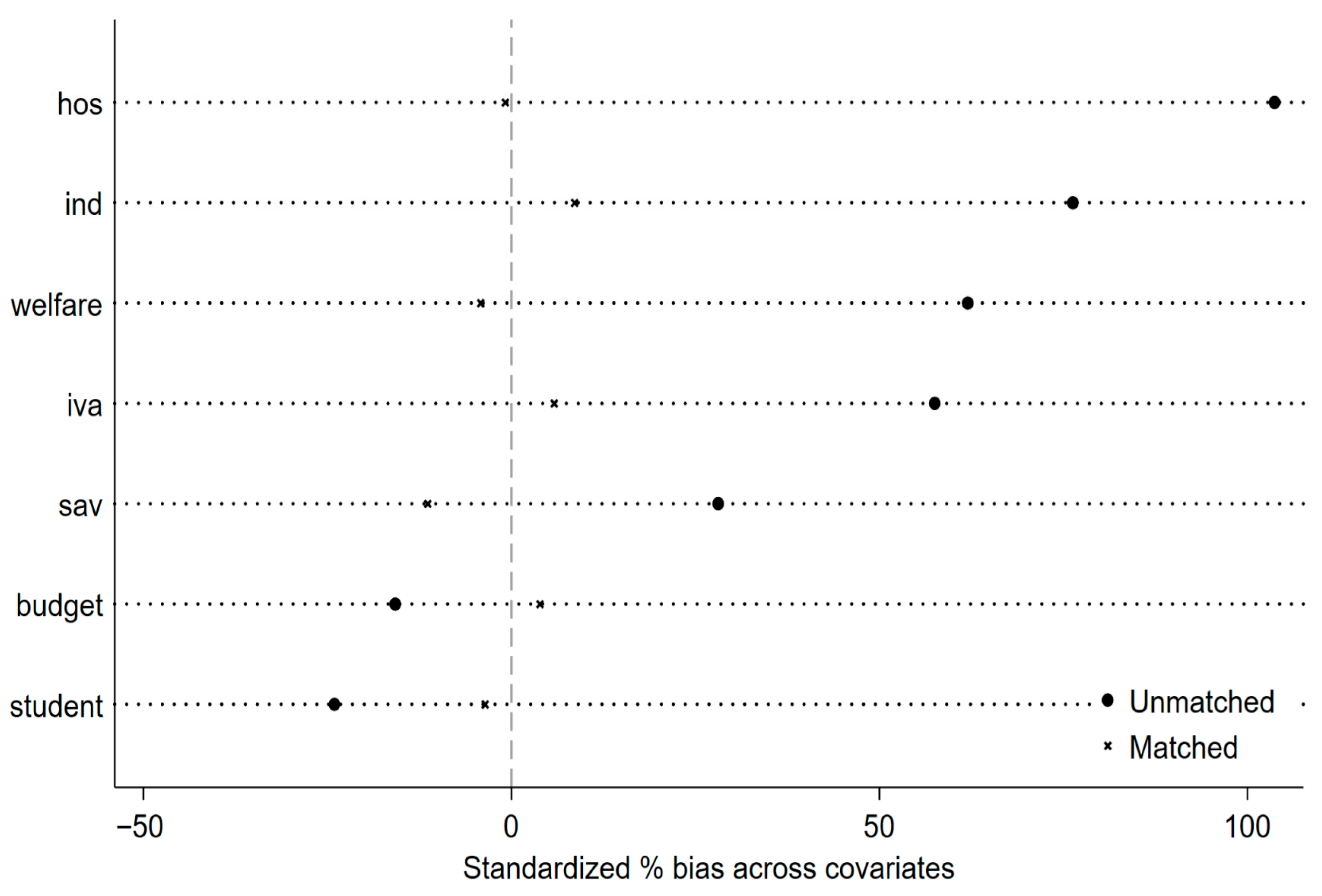 Figure 6 illustrates the variation in standardized bias of major covariates before and after the matching procedure. In the figure, black dots represent the bias for unmatched samples, while crosses represent the bias after matching. The findings reveal that before matching, the majority of covariates, especially industrial added value (iva), industrial output (ind), residents’ savings (sav), and the number of students (student), exhibited notable deviations from the zero line, reflecting considerable imbalance in covariate distributions between the treated and control groups. Following the matching process, the standardized biases of most covariates move substantially closer to the zero line and show a more clustered distribution without evident outliers, indicating that the covariate balance between groups has been successfully improved. Notably, the most biased variables (e.g., ind and iva) show substantial reductions in bias after matching, significantly reducing the potential interference of sample heterogeneity with the estimation results.