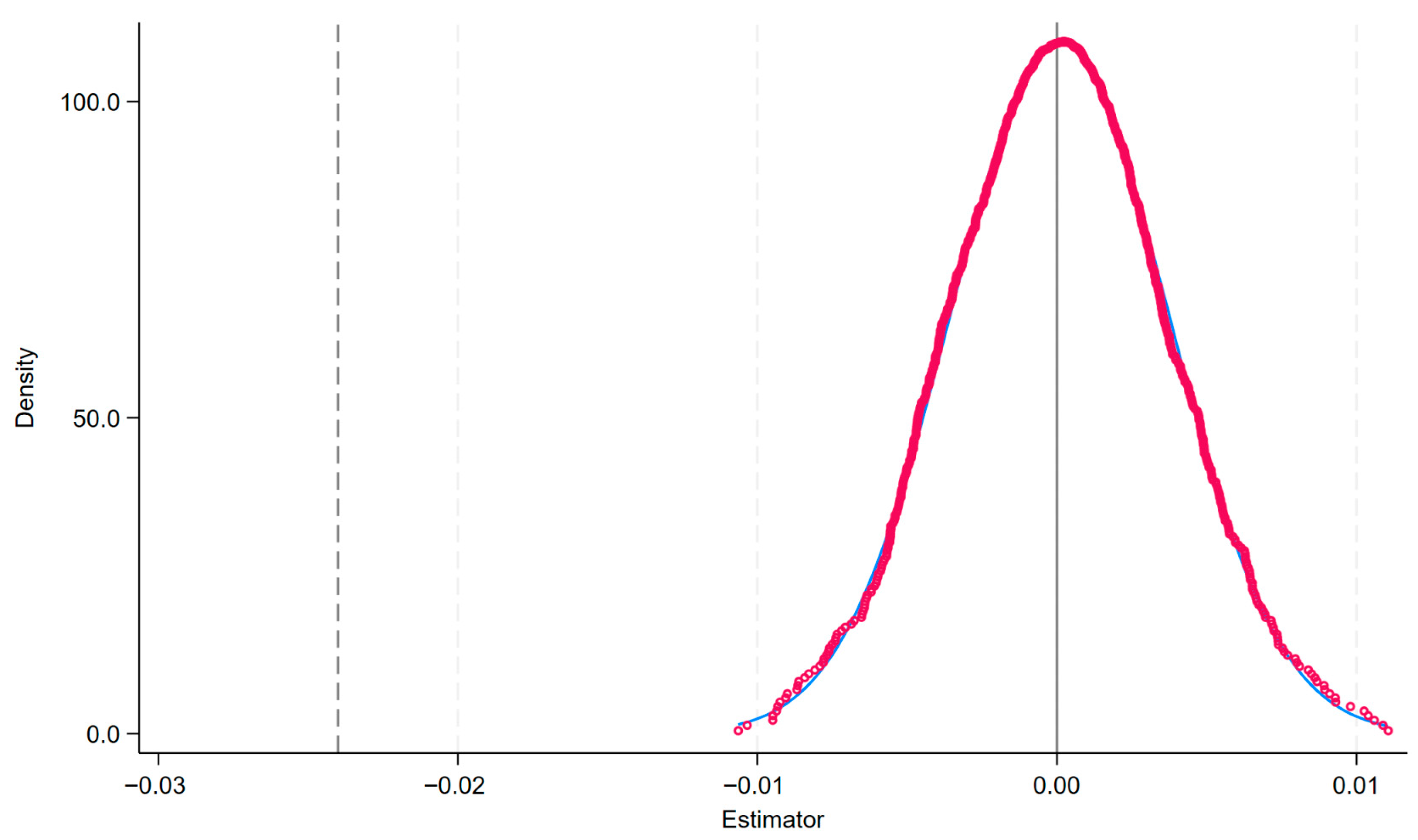 Figure 7 displays the outcomes derived from the placebo simulation exercise. The x-axis illustrates the placebo treatment effects generated through random assignment, whereas the y-axis depicts their corresponding kernel density distribution. As shown, the placebo estimates produced through random reassignment form a symmetric, bell-shaped distribution centered at zero, consistent with the statistical characteristics expected under a randomization-based process. In comparison, the dashed line indicating the actual DID estimate (around −0.023) is located at the far end of the distribution’s tail, well separated from the central mass of the placebo estimates. This result indicates that the probability of obtaining an effect of similar magnitude under random assignment is extremely low, thereby reinforcing the credibility of the baseline regression findings. In other words, the empirical results are more likely to reflect a true causal effect induced by the implementation of the NECCDZ policy, rather than a spurious correlation driven by random assignment or structural features of the data.
