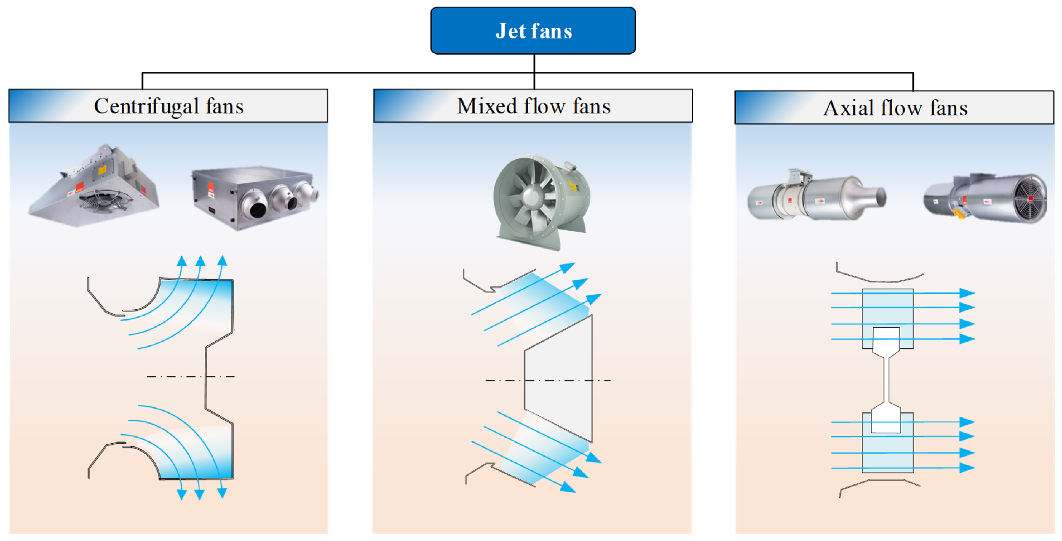 - Betta, V.; Cascetta, F.; Musto, M.; Rotondo, G. Fluid dynamic performances of traditional and alternative jet fans in tunnel longitudinal ventilation systems. Tunn. Undergr. Space Technol. 2010, 25, 415–422. [Google Scholar] [CrossRef]