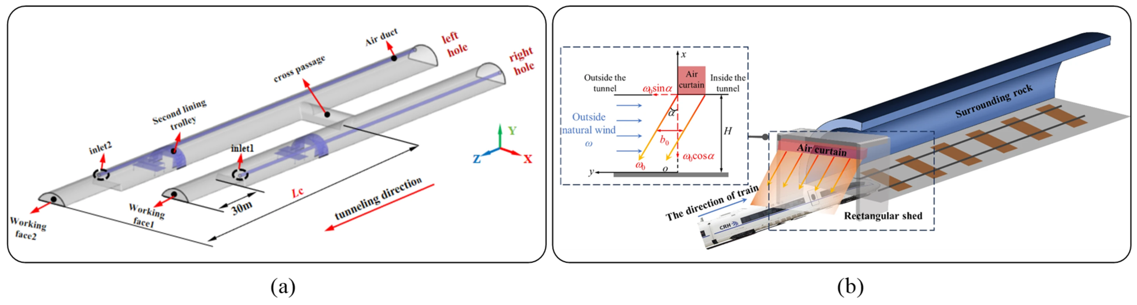 - Zeng, Y.; Tao, L.; Luo, M.; Ye, X.; Yuan, Y. Influence of piston airflow and mechanical airflow on cooling effect of high-geothermal tunnels: A pilot study. J. Therm. Anal. Calorim. 2023, 148, 6151–6167. [Google Scholar] [CrossRef]