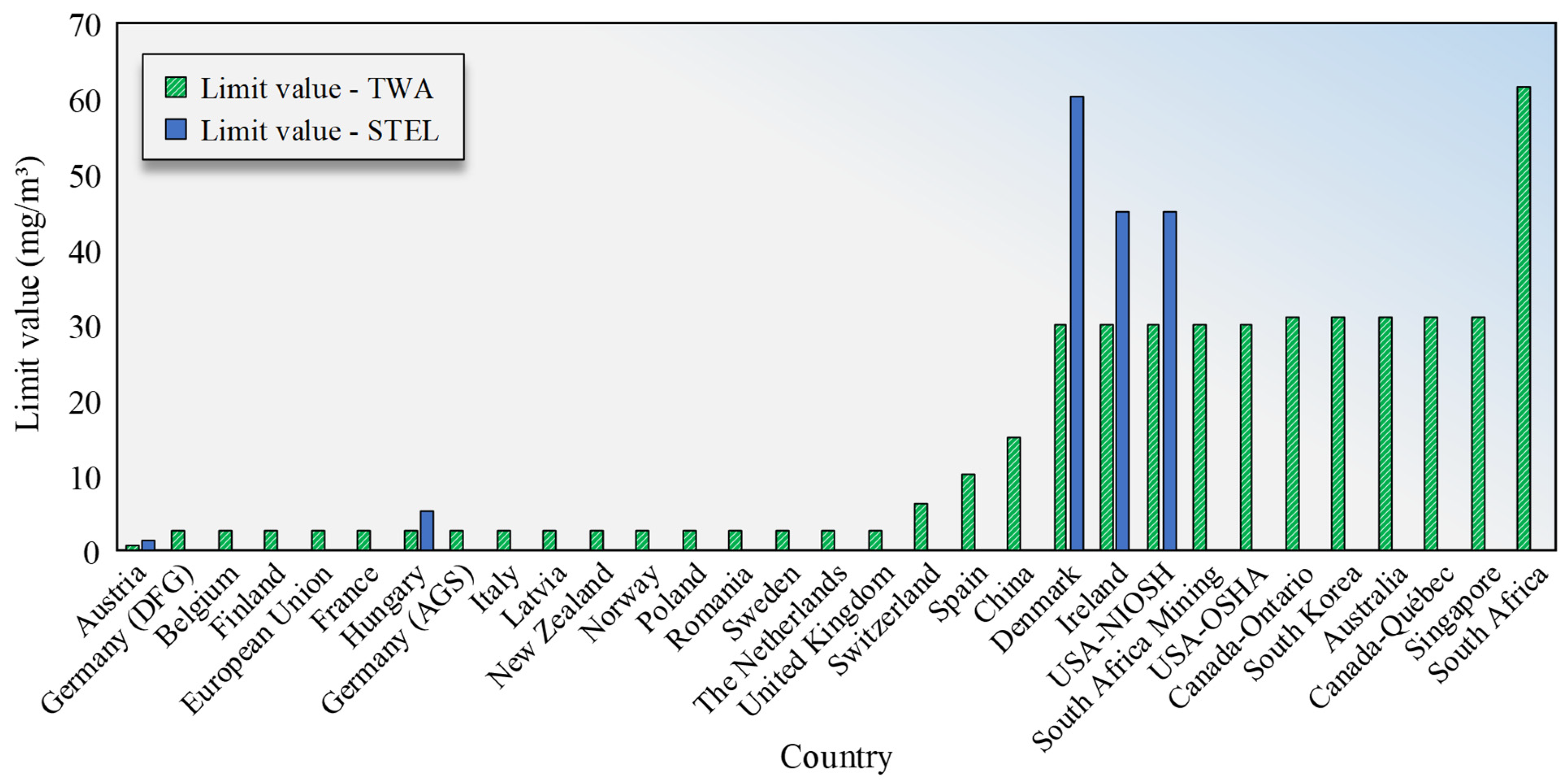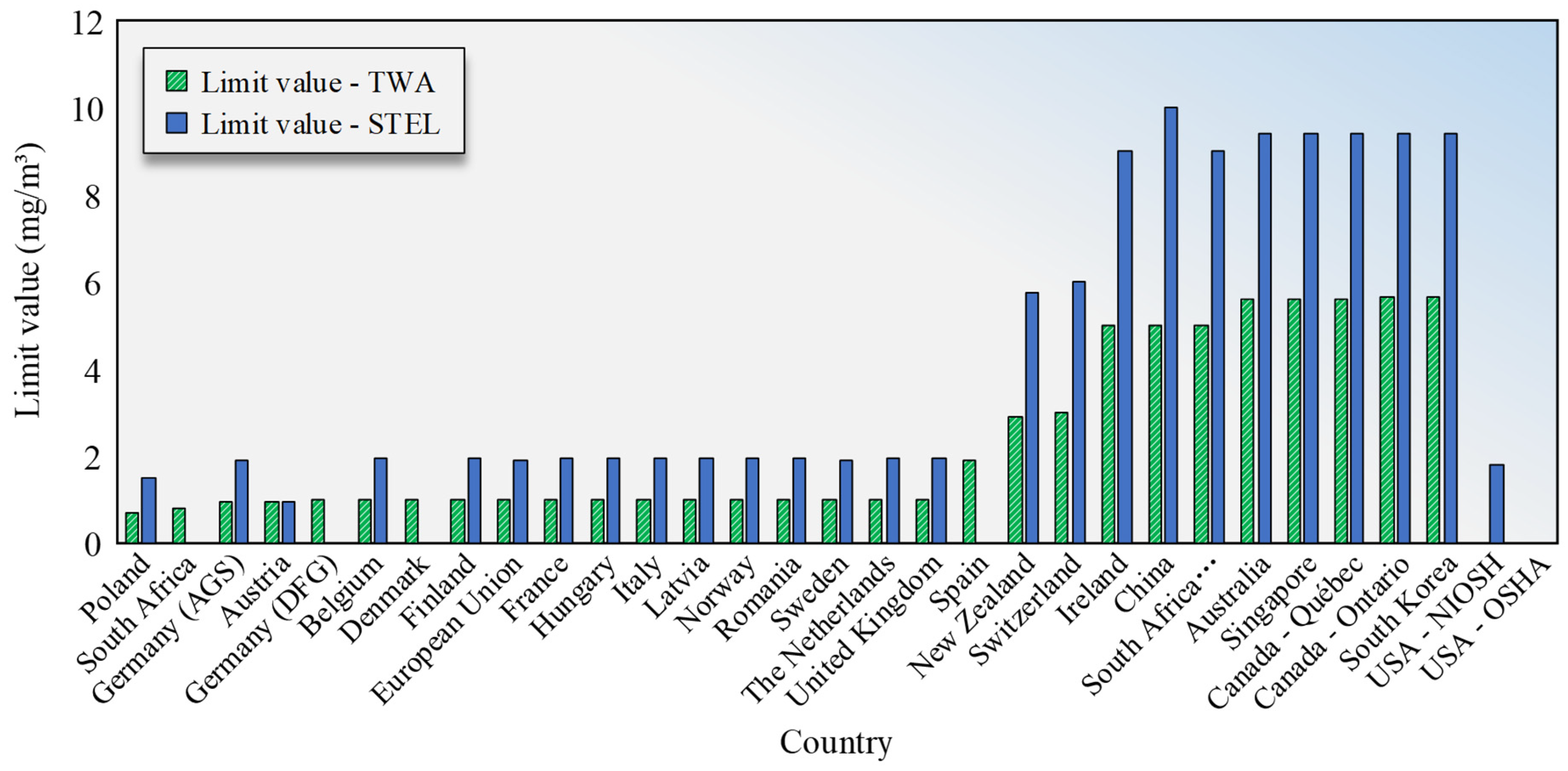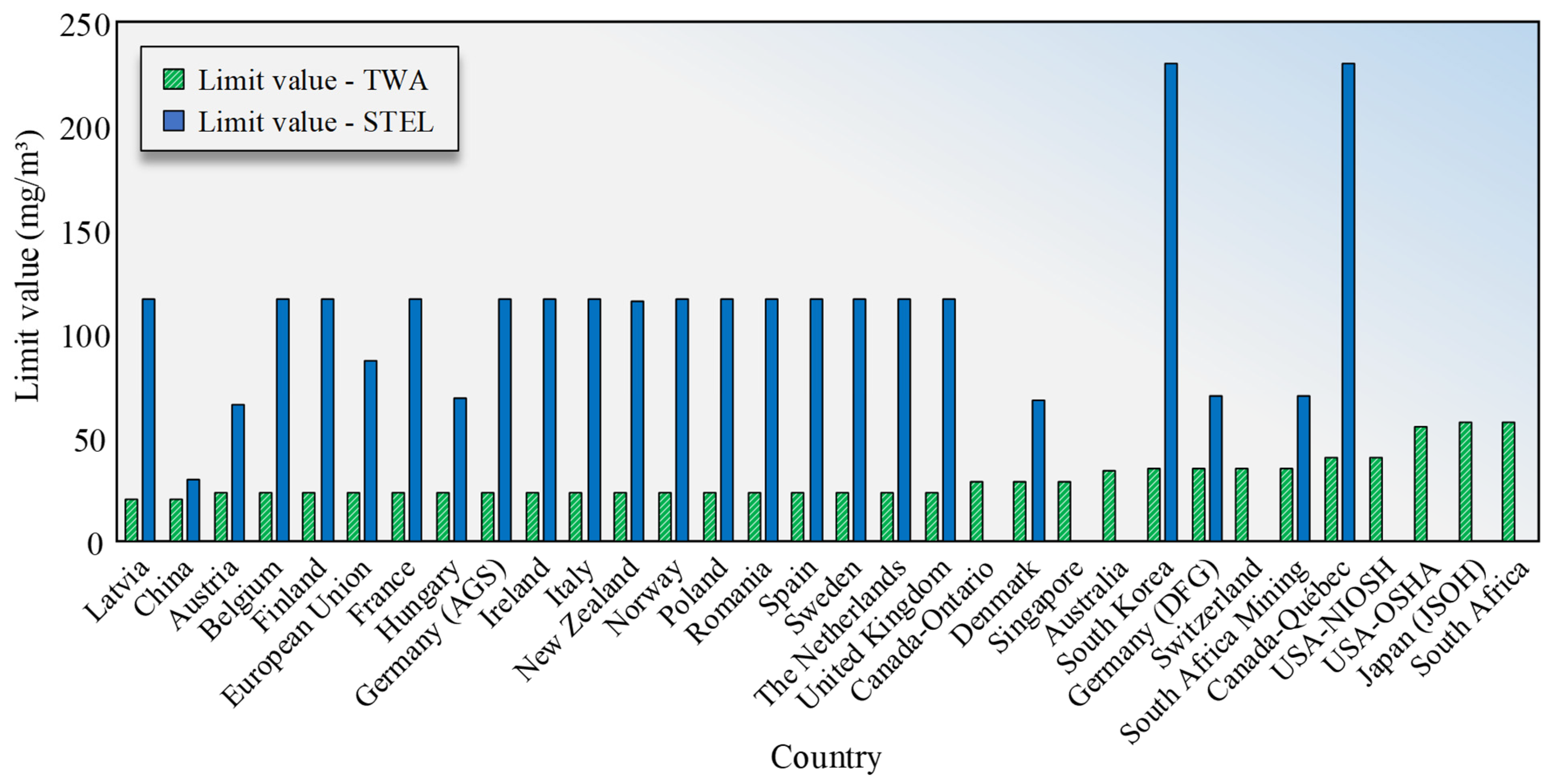 | Quartz dust | PC-TWA | 8 (MSiO2 < 10%) 1 (MSiO2 > 10%) | |||