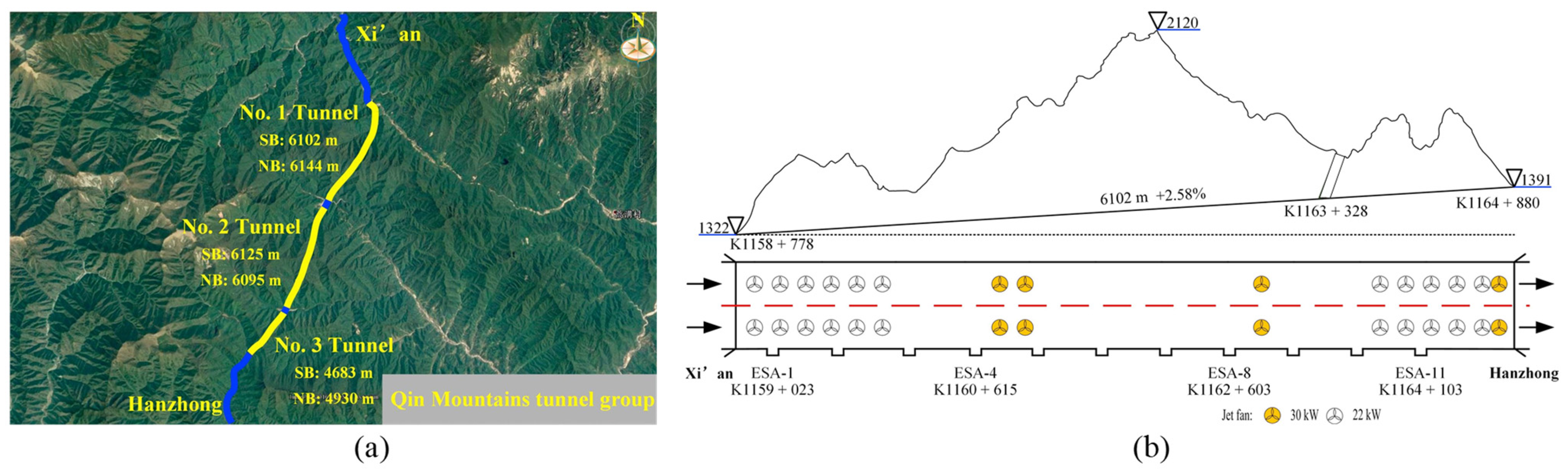 - Xia, F.Y.; Song, S.Y.; Xie, Y.L. Application of Twin-Tube Complementary Ventilation in Highway Tunnels. Mod. Tunn. Technol. 2017, 54, 160–166. (In Chinese) [Google Scholar]