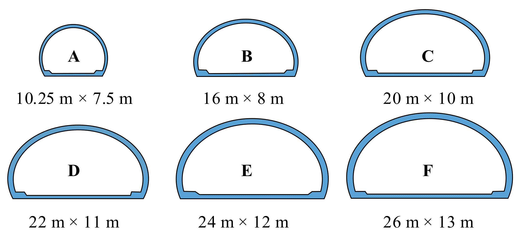 6.2. Cross-Section Size, Length, and Gradient of the Tunnel