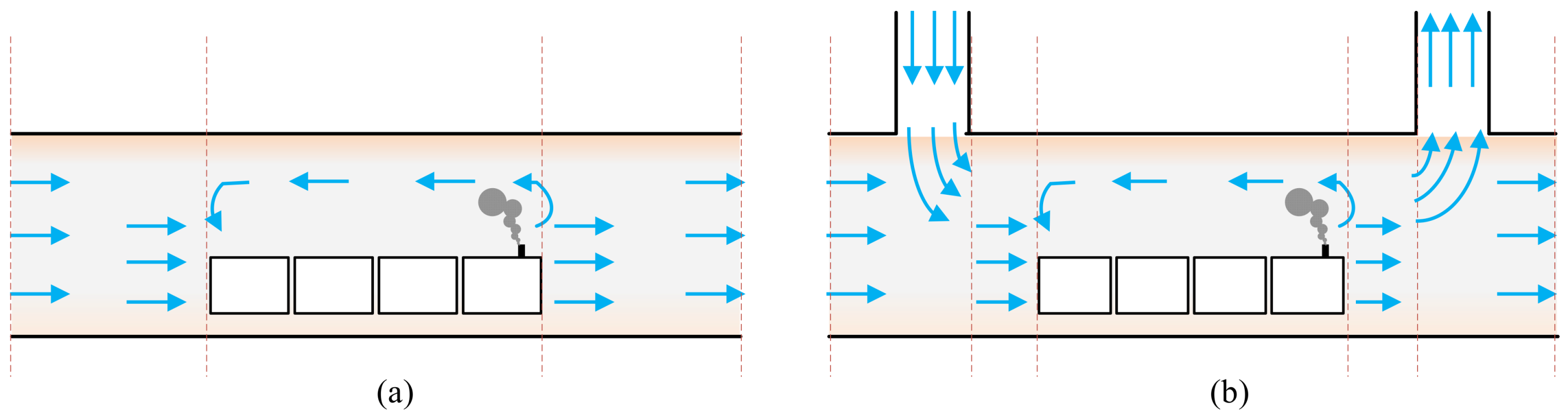 - Chi, D. Ventilation and Smoke Exhaust Design of Single-hole Double-track-Underground Tunnel. J. Railw. Eng. Society 2020, 37, 69–73. (In Chinese) [Google Scholar]