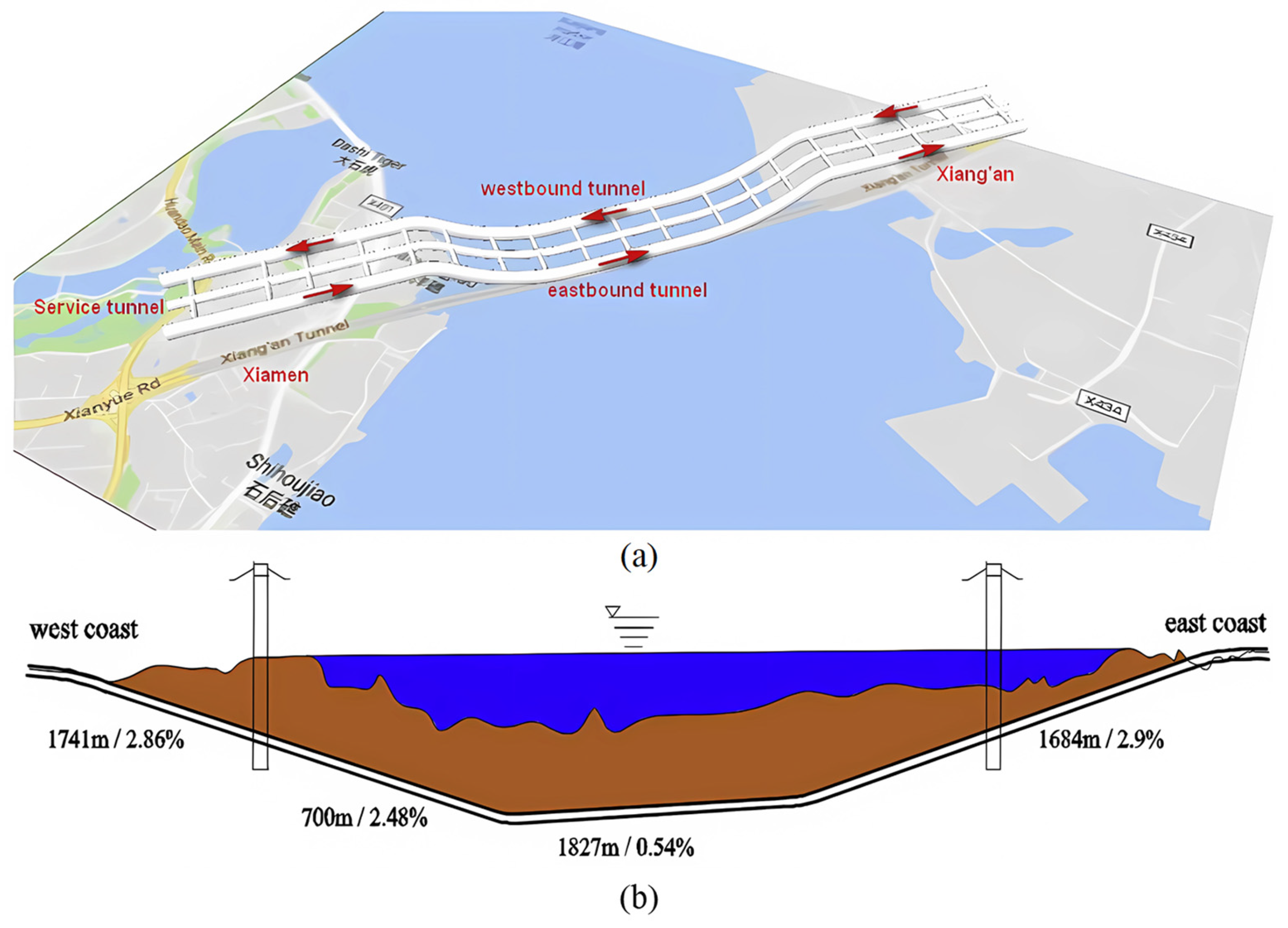 - Wang, M.; Wang, X.; Yu, L.; Deng, T. Field measurements of the environmental parameter and pollutant dispersion in urban undersea road tunnel. Build. Environ. 2019, 149, 100–108. [Google Scholar] [CrossRef]