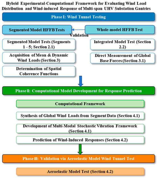 To address these challenges, this study proposes a hybrid experimental and computational framework to accurately determine wind load distribution and wind-induced responses of multi-span UHV substation gantries. The overall workflow of the proposed hybrid framework is illustrated in Figure 1. Phase I is segmented and global wind load testing. The whole structure is segmented into representative components based on distinct structural characteristics. Five critical segment models are independently tested via the HFFB technique to quantify both mean and dynamic wind loads. Concurrently, HFFB tests on the whole substation gantry model are conducted, wherein directly measured base shear forces and overturning moments are compared with aggregated results derived from segment model data, thereby validating the reliability of the segmented testing methodology. Phase II is computational model development for response prediction. A computational method based on structural stochastic vibration theory is developed. This model integrates mode shapes, spatial coherence, and cross-modal contributions, using the spatially distributed wind loads obtained from Phase I as input. Phase III is validation via aeroelastic model wind tunnel test. The feasibility of the computational framework is rigorously verified by comparing its predictions with experimental outcomes from aeroelastic model tests under identical wind conditions. Through this three phase workflow, the study bridges experimental precision with theoretical rigor, advancing the application of HFFB techniques and delivering a reliable framework for the wind-resistant evaluation of critical UHV infrastructure.
