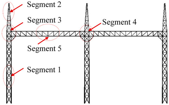 As shown in Figure 2, a 1000 kV substation gantry comprises a 61 m high lattice frame, featuring two 51 m spans. Five representative segments (Segments 1 to 5) are extracted from the 1000 kV substation gantry to serve as prototypes for the test models, as illustrated in Figure 3. Segments 1 and 2 represent the typical tower body sections. Located in the mid-height and upper regions of the main towers, these segments are critical for determining the global base shear and overturning moment of the structure. Segments 3 and 4 represent the critical tower-beam connection zones. These segments are structurally complex, featuring a transition in geometry. This discontinuity in structural form leads to complex, three-dimensional flow patterns and localized concentrations of wind load. Segment 5 represents the long-span beam. This segment is aerodynamically sensitive due to its large slenderness and unique cross-section.