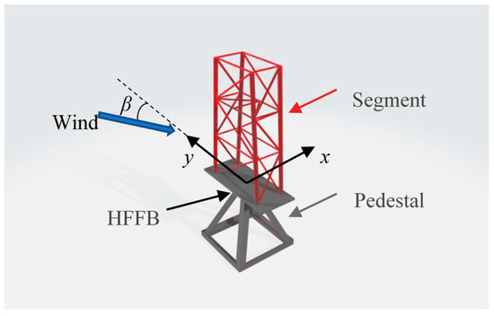 These representative segments are subsequently scaled down at a ratio of 1:30 using stainless steel tubes as shown in Figure 4. Figure 5 shows the custom-designed pedestal used to rigidly secure the models within the wind tunnel and defines the wind direction β and local coordinate system, taking Segment 1 as an example. Each segment model underwent independent HFFB testing under a uniform turbulent flow field with a constant wind speed (U = 10.5 m/s) and turbulence intensity (Iu = 0.1) as shown in Figure 6. In the wind tunnel test, base shear forces and overturning moments are measured by an ATI Delta HFFB system, configured with a sampling frequency of 500 Hz and a measurement duration of 60 s for each test case.