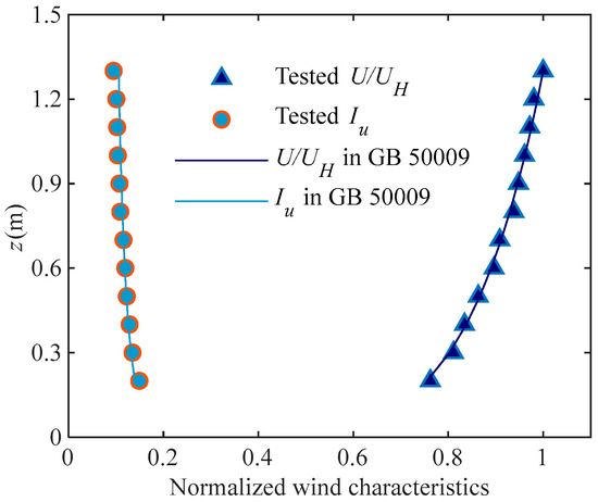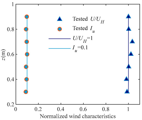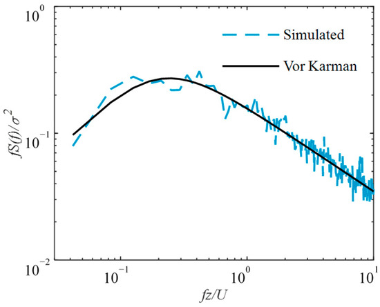 As depicted in Figure 7, a whole substation gantry model fabricated from stainless-steel tubes is tested by HFFB. The wind direction and global coordinate system are defined as shown in Figure 8. Since the substation gantry is situated in a flat area, this wind tunnel test is conducted in terrain B (exponent α = 0.15) as defined by GB50009–2012 [42]. The target exponential profile is physically generated using a well-established passive simulation technique with spires and roughness elements, and the tested wind profile is presented in Figure 9. As shown in Figure 10, the wind speed power spectral density (PSD) shows a good fit with the Vor Karman PSD. The mean oncoming wind speed at the top of the structure, at a height of 1.22 m, is 9 m/s. The sampling frequency of the HFFB is 500 Hz, and the measurement duration is 60 s for each test case.