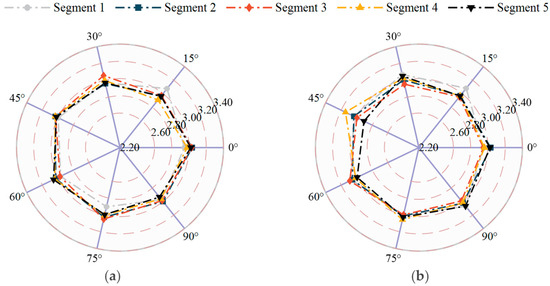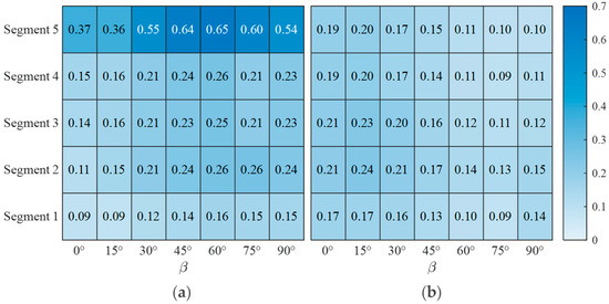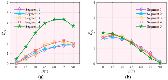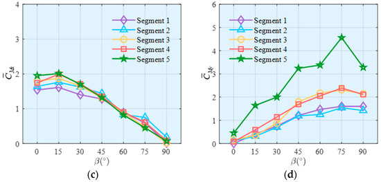 As illustrated in Figure 11, the general trends of C ¯ F and C ¯ M for each segment are comparable in the corresponding axis. C ¯ F x and C ¯ M y start near zero, peak at around β = 75°, and then experience a slight decline. Conversely, C ¯ F y and C ¯ M x show a slight increase, reach the maximum at β = 15°, and then decrease as the wind direction increases. It is important to note that Segments 1 to 4 represent tower segment models with similar rectangular cross-sections, resulting in comparable coefficients across these models. For Segment 5, however, the value of C ¯ F x and C ¯ M y is significantly higher compared to that of the other segments, primarily due to its long span and smaller windward area in the x-axis. For example, its mean base shear coefficient in x direction of approximately 4.34 at β = 75° is more than double the values for the tower segments (Segments 1–4), which range from 1.74 to 2.27.