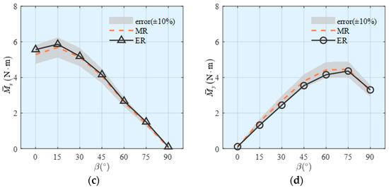 Figure 11. Mean wind force coefficients: (a) C ¯ F x ; (b) C ¯ F y ; (c) C ¯ M x ; (d) C ¯ M y .