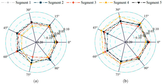As illustrated in Figure 12, the direct measured results (MR) obtained from the test of the entire model in each wind direction demonstrate a high degree of consistency with the estimated results (ER) derived from Equations (3) and (4) through the tests of segment models. The error is far within ±10%. This consistency validates the effectiveness of the HFFB wind tunnel tests on segment models. In other words, the impacts of three-dimensional flow in these segment tests are deemed to be relatively negligible.