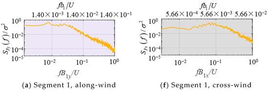 The normalized PSD of wind loads plays a critical role in the wind-resistant design of substation gantries by providing insights into the frequency-dependent energy distribution of wind-induced forces. Figure 16 presents the normalized PSD of wind loads on different segments of the substation gantry at β = 0°, demonstrating consistent variation patterns in normalized PSD at varying heights. The abscissa axis, fB/U and fb/U is non-dimensional wind speed, where B represents the windward width at the base of the segment and b denotes the diameter of the segment’s main rod. As can be seen in Figure 16a–e, the along-wind PSD of wind loads exhibit frequency distribution characteristics closely aligned with those of the along-wind PSD of wind velocity, primarily induced by incoming flow turbulence.
