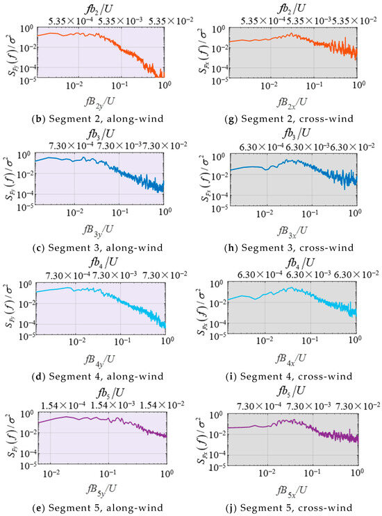 Figure 16. Normalized wind load PSD of different segments. (a) Segment 1, along-wind; (b) Segment 2, along-wind; (c) Segment 3, along-wind; (d) Segment 4, along-wind; (e) Segment 5, along-wind; (f) Segment 1, cross-wind; (g) Segment 2, cross-wind; (h) Segment 3, cross-wind; (i) Segment 4, cross-wind; (j) Segment 5, cross-wind.