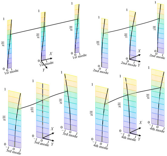 where q j t , q ˙ j t , and q ¨ j t are the generalized coordinates of displacement, velocity, and acceleration for the j-th mode, respectively; and φ j is the j-th mode shape of the structure. The first four mode shapes of the substation gantry are considered in calculation as illustrated in Figure 17. These mode shapes are obtained through a finite element analysis, where a detailed numerical model of the gantry is developed, incorporating the actual geometric configuration, material properties, and boundary conditions. The modal analysis is then performed to extract the natural frequencies and corresponding mode shapes.
