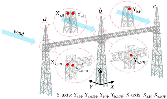 To validate the proposed computational method, the predicted wind-induced responses of the substation gantry are rigorously benchmarked against measurements from aeroelastic model tests as shown in Figure 18, the detailed description of which can be found in the previously published work [28]. The geometric and dynamic characteristics of the computational model are fully consistent with those of the aeroelastic model. This comparative analysis provides a direct performance evaluation of the computational framework under realistic wind conditions. Aerodynamic damping ratios, identified from the aeroelastic model test data, are incorporated into the computational framework to ensure consistent calculation conditions. Figure 19 illustrates the configuration of measurement points on the aeroelastic model, which includes key positions at the top of tower a and tower b (i.e., Ya,H, Yb,H) and mid-height (i.e., Ya,0.7H, Yb,0.7H) of the structure, as well as cross-wind measurement points (i.e., Xa,H, Xa,0.7H).