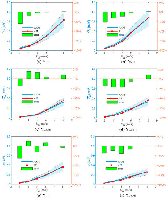 Figure 20 provides a direct comparative analysis between calculated acceleration responses (denoted as AH, derived from the HFFB-based methodology) and experimentally measured values (denoted as AAM obtained through aeroelastic model testing) at specified monitoring points under varying wind speeds. The AH and AAM results demonstrate close agreement in both response magnitude and variation trend, particularly under high wind speed conditions. This agreement is quantified at the top of the structure, where predictions deviate by less than ±4% from the measured values. Furthermore, critical insights into wind-induced structural responses can be extracted from comparative data. Notably, the along-wind acceleration responses at the top of the central tower (Yb,H) and side tower (Ya,H) exhibit nearly identical values. The cross-wind responses at the top (Xa,H) and mid-height (Xa,0.7H) of the side tower exhibit approximately 50% lower magnitudes compared to their along-wind counterparts; however, their relative contribution to overall structural responses remains significant. Cross-wind contribution to structural responses remains non-negligible, necessitating careful consideration in design optimization.