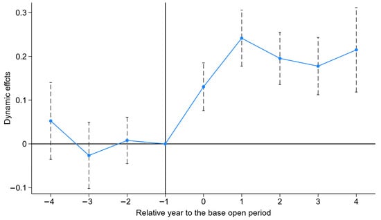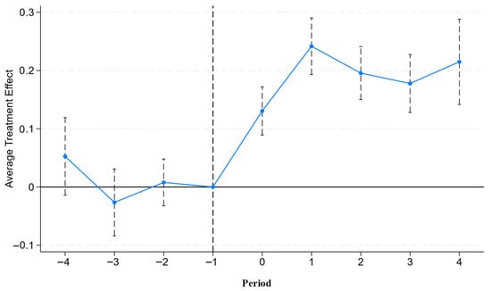 Section 4.2 preliminarily validated the parallel trends assumption. However, the recent literature indicates that the traditional two-way fixed effects model may yield biased estimates when heterogeneous treatment effects are present in staggered DID settings [51]. To mitigate this potential bias, we employ the stacked estimator for heterogeneous treatment effects, following the methodology of existing studies [52], to re-examine the dynamic effect of the GODPs on corporate ESG performance. As shown in Figure 4, there are no significant differences in ESG performance between the firms in affected and unaffected cities before the launch of GODPs. However, following platform launches, the ESG performance of firms in the treatment cities is significantly higher than that of firms in the control cities. This confirms that the parallel trends assumption holds even when accounting for heterogeneous treatment effects, and our fundamental conclusion remains robust.