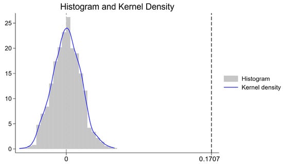 A potential concern is that unobservable confounding factors, which are simultaneously correlated with both the establishment of GODPs and corporate ESG performance, may bias our results. To address this issue, we conducted a placebo test. First, we randomly assigned the launch cities and years to construct a pseudo-treatment group and then re-estimated Equation (1). Then we repeated this random sampling process 1000 times and plotted the kernel density of the estimated coefficients. Figure 3 presents the kernel density distribution of the 1000 placebo coefficients generated from this procedure. We highlight two key analytical insights from this figure. First, the distribution is centered tightly around zero and approximates a normal distribution, which is the pattern we would expect if the policy assignment were random and had no true effect. Second, our baseline estimate of 0.1707 (indicated by the dashed vertical line on the right) lies far in the right tail of this placebo distribution, with none of the simulated coefficients exceeding its value. Thus, we can statistically reject the possibility that our actual result is a product of chance; the p-value implied by this test is effectively below 0.01. Collectively, this evidence strongly suggests that the significant improvement in ESG performance is a genuine causal effect of the GODPs and cannot be explained by unobserved confounders.