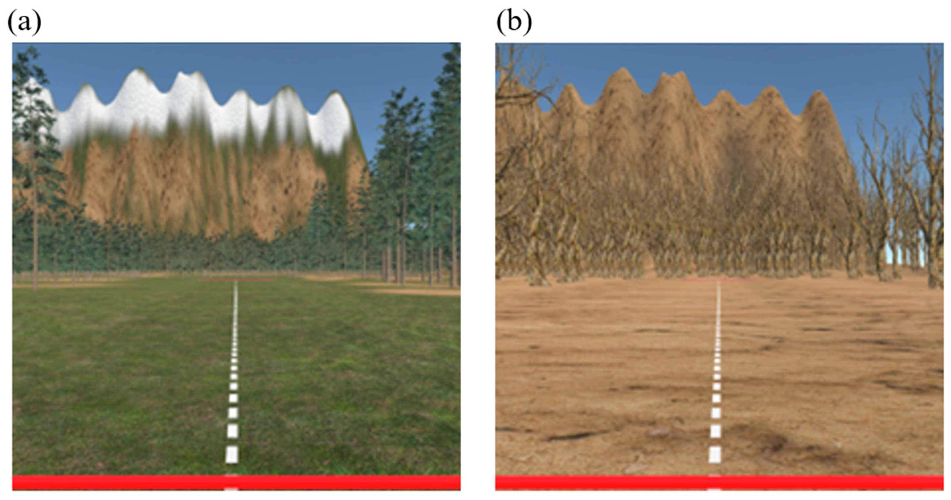 Virtual Environments: Participants experienced four immersive Virtual Environments (VEs) developed with Unity (version 2021.2.20f1; Unity Technologies, San Francisco, CA, USA), presented through HTC Vive Pro 2 HMD (HTC Corporation, Taoyuan City, Taiwan). Two scenarios represented verdant landscapes, and two scenarios represented arid landscapes (as an example, see Figure 1a,b). The environments were matched for structural features (e.g., global configuration, horizon line, environmental elements, size), differing only in ecological qualities (green vs. arid). In the verdant scene, the path was immersed in a dense forest, with tall coniferous trees extending on both sides. The ground texture consisted of green grass. On the horizon, a green mountain with snow-covered peaks was visible. In the arid scene, the environment surrounding the path was an arid landscape, with a ground texture of sandy, cracked soil, dry leafless trees on both sides, and a barren mountain on the horizon. In both scenes, a directional light was used with rotation: x = 50; y = −30; z = 0, hex color FFF4D6, in real-time mode, intensity 1, indirect multiplier 1, render mode = auto, culling mask = everything. Each environment included a short route and a long route that were the same length, had the same configuration and could be travelled in first person. The short paths measured 38 m (mean real walking time ≈ 30 s), while the long paths measured 48 m (mean real walking time ≈ 36.5 s). Path lengths (38 m and 48 m) were selected based on pilot testing to ensure clear perceptual discrimination while keeping walking durations within a comfortable range for treadmill locomotion. Metric distances were identical across verdant and arid environments by design. For real walking times, independent-samples t-tests showed that there were no significant differences between verdant and arid short paths (M = 29.97 s, SD = 9.31 vs. M = 30.43 s, SD = 9.56; t(33) = 0.35, p = 0.73) nor between verdant and arid long paths (M = 37.24 s, SD = 12.23 vs. M = 35.97 s, SD = 10.88; t(33) = 0.77, p = 0.44). Thus, any differences in subjective estimates cannot be attributed to actual variations in walking time or different metrics.